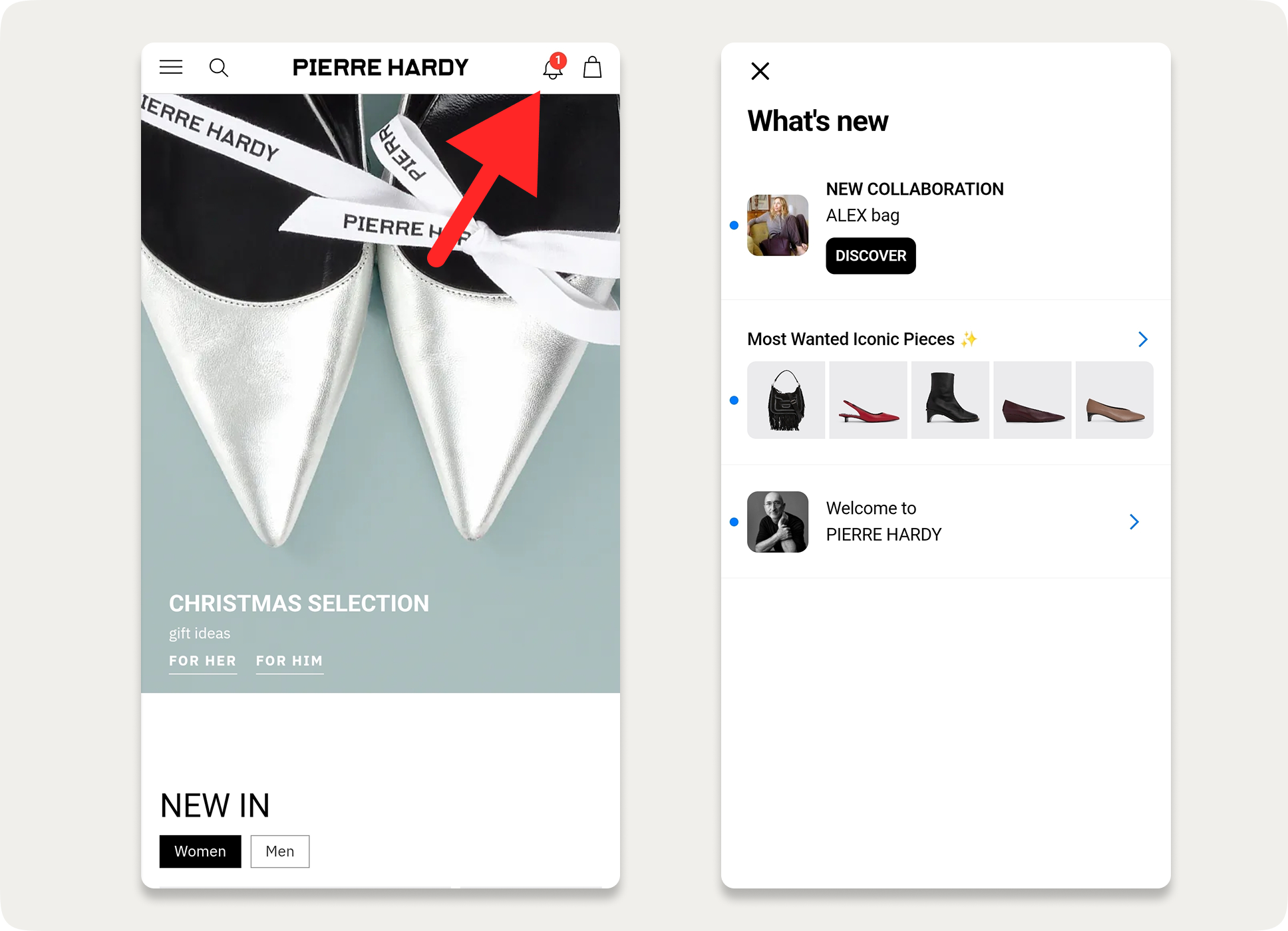 Pierre Hardy shows related products in messages embedded in the cart addition confirmation window.