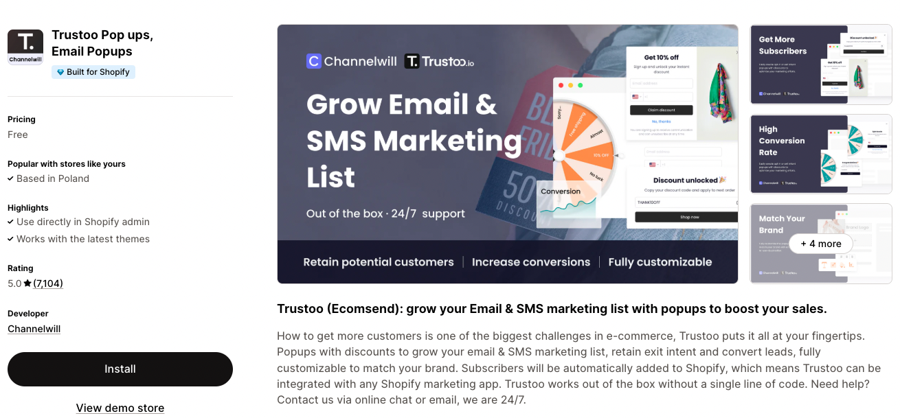 Trustoo Pop Ups is a free Shopify popup app designed to help stores grow their email lists, boost sales, and capture more emails without added costs. It’s one of the most popular free apps in the category, with seven thousands of positive reviews as of September 2025.