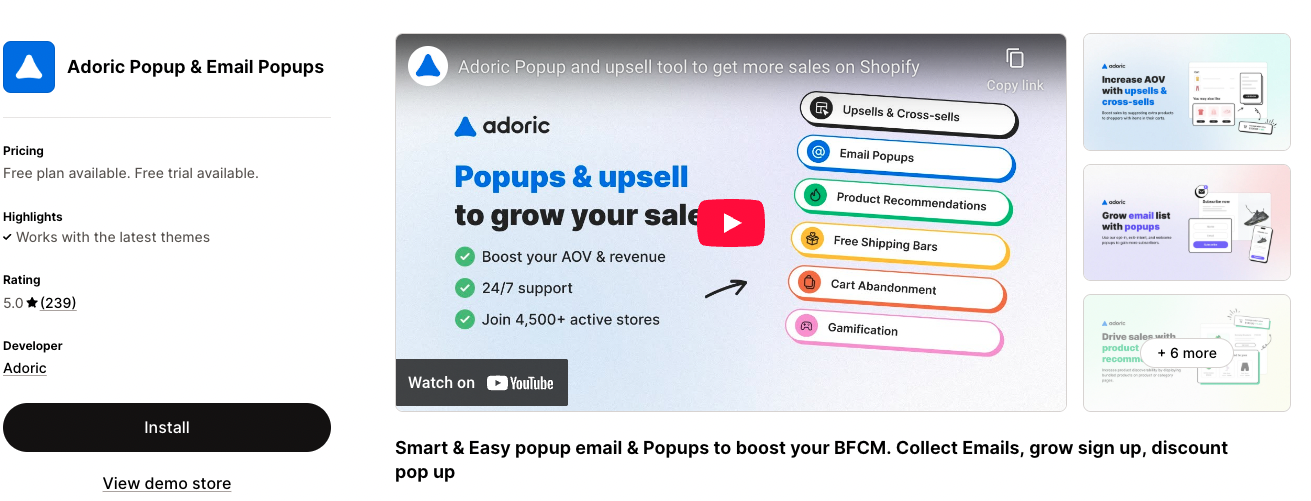 Like many other best Shopify popup apps here, Adoric Popups offers an all-in-one option. You can create multiple types of campaigns to capture emails, share marketing messages, and recover abandoned carts.