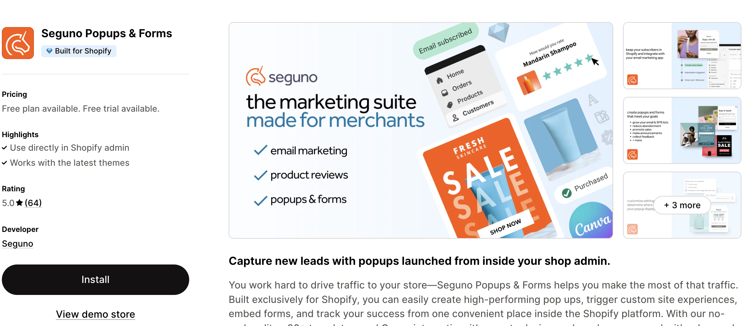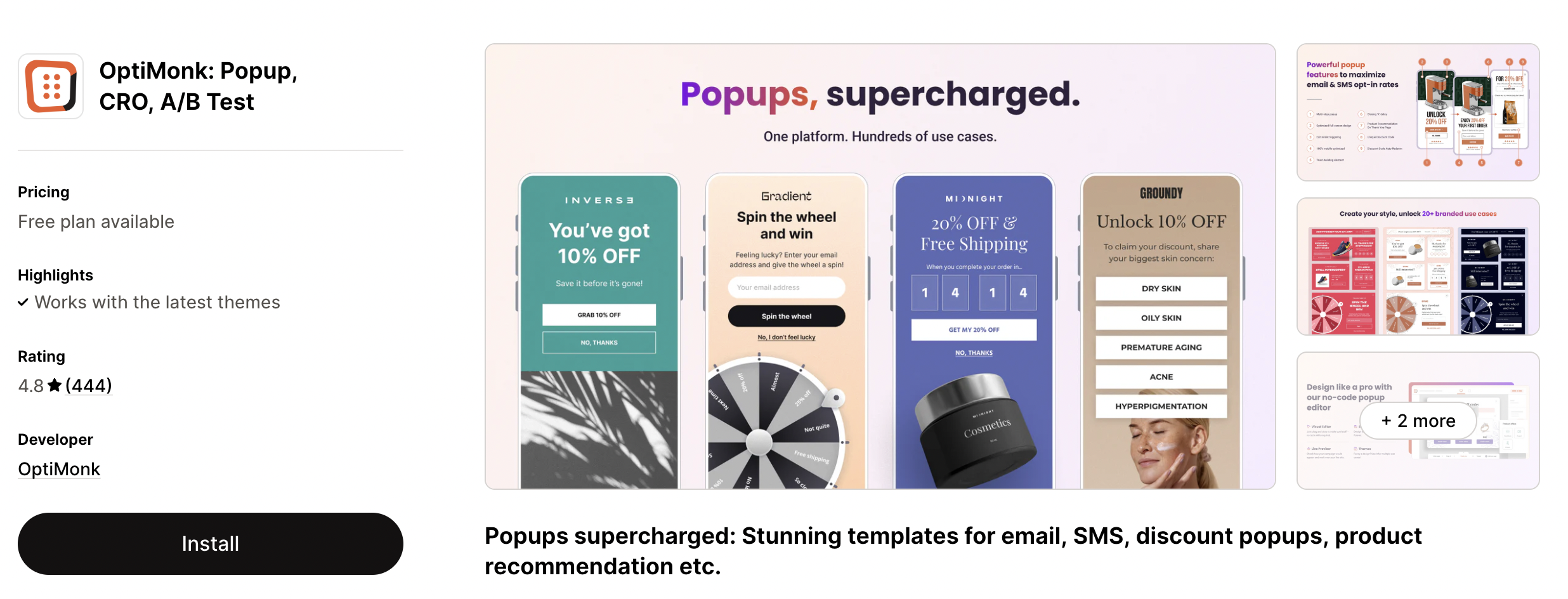 This popup app for Shopify uses the scale-as-you-grow pricing model. You start with a free plan with 20 orders and pay for milestones (100, 101-200, 201-500) $4.99, $9.99, and $24.99/mo respectively).