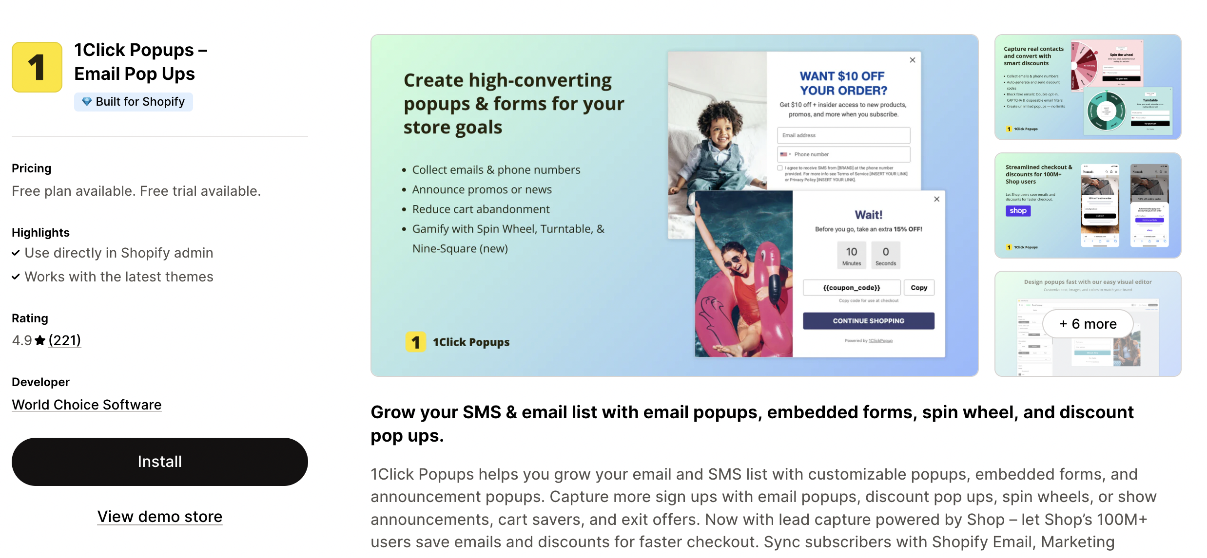 1Click Popups is a simple, no-frills Shopify popup app focused on helping merchants grow their subscriber list and promote offers with minimal setup. It’s especially popular with small and medium-sized stores looking for a lightweight solution without the complexity of advanced popup builders.