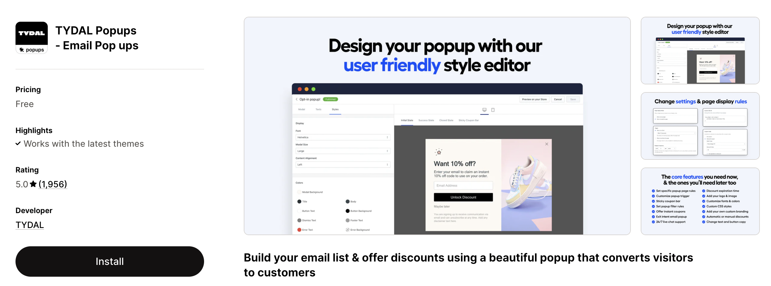 TYDAL (previously Rivo Popups) is a free Shopify app built to help stores grow their email subscriber list using popups with discounts. It’s great for businesses who want simple, effective email capture without complicated workflows.