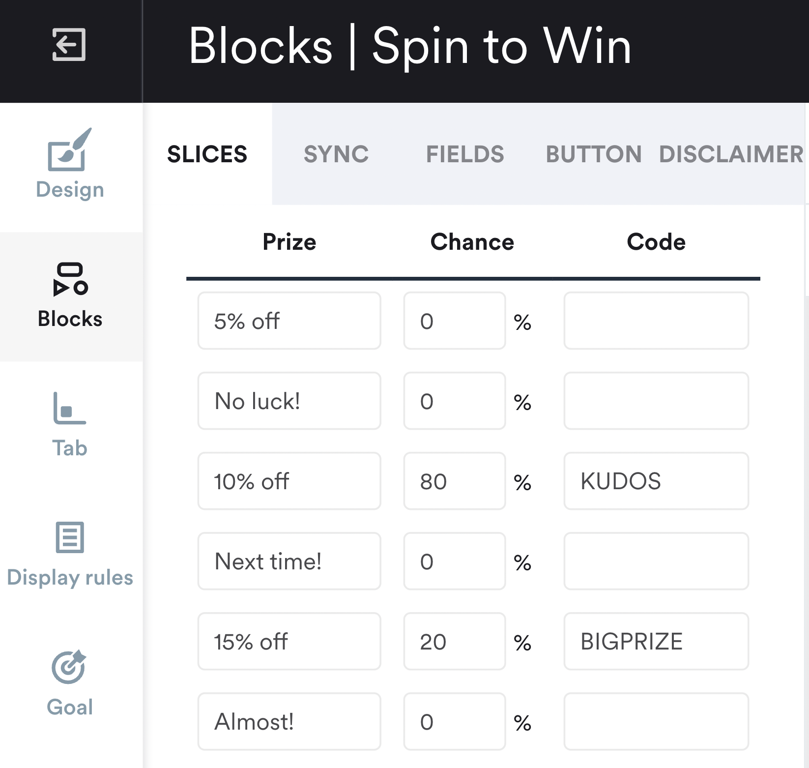 Define the winning odds for every prize (here’s how this setting typically looks in popup software):