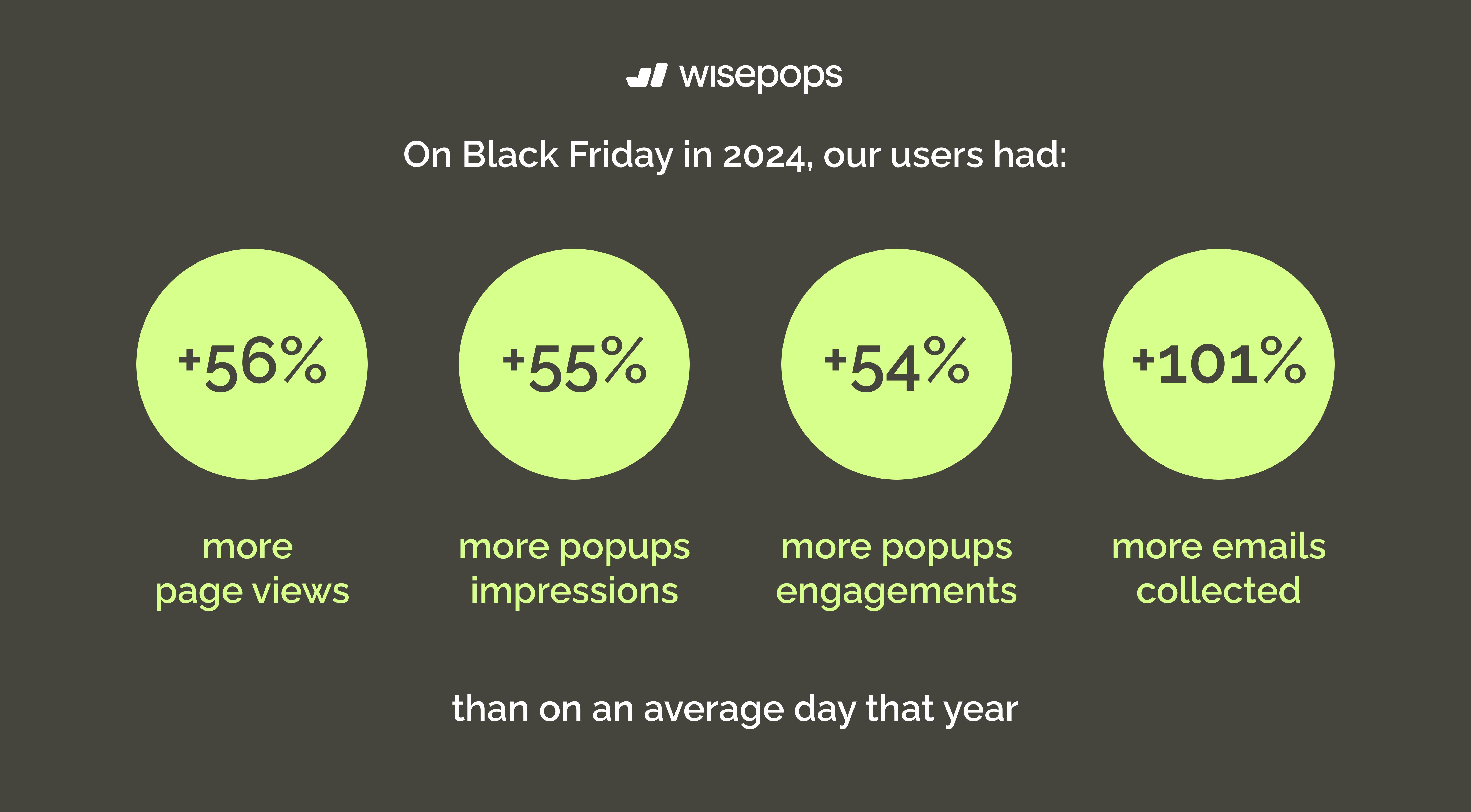 We checked the data from our clients who used Wisepops popup builder on Black Friday and found that popup campaigns can capture up to 101% more emails than during any other day: