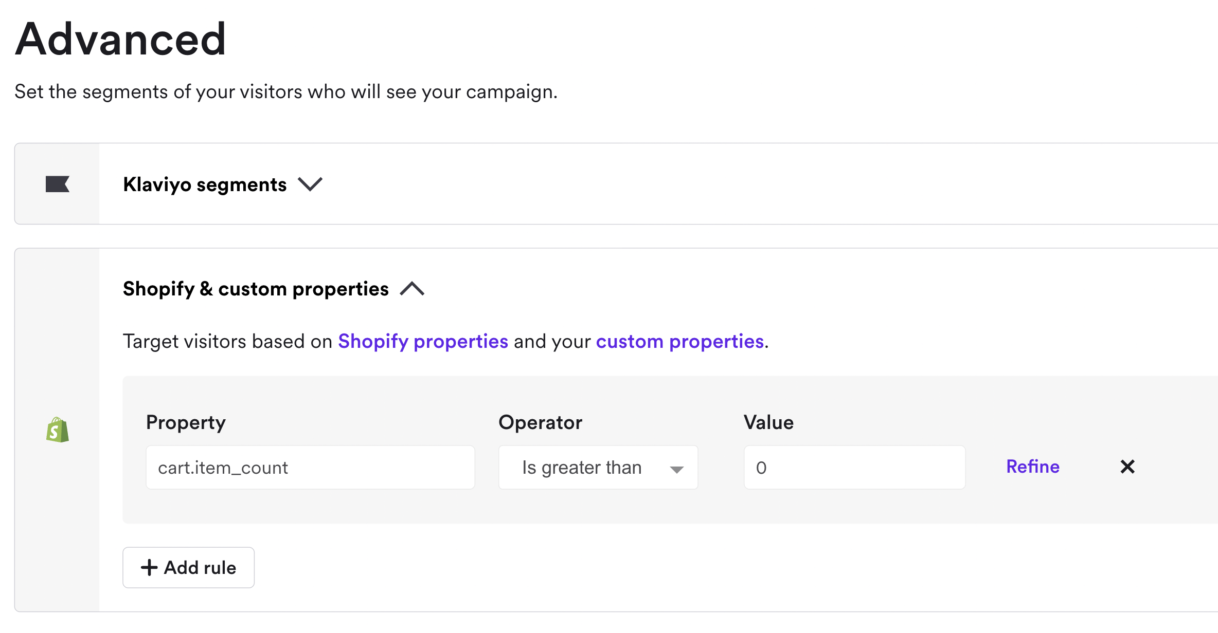 If you're on Shopify, you'll also be able to further customize the trigger. In Display Rules > Advanced, you'll find native Shopify campaign display options.