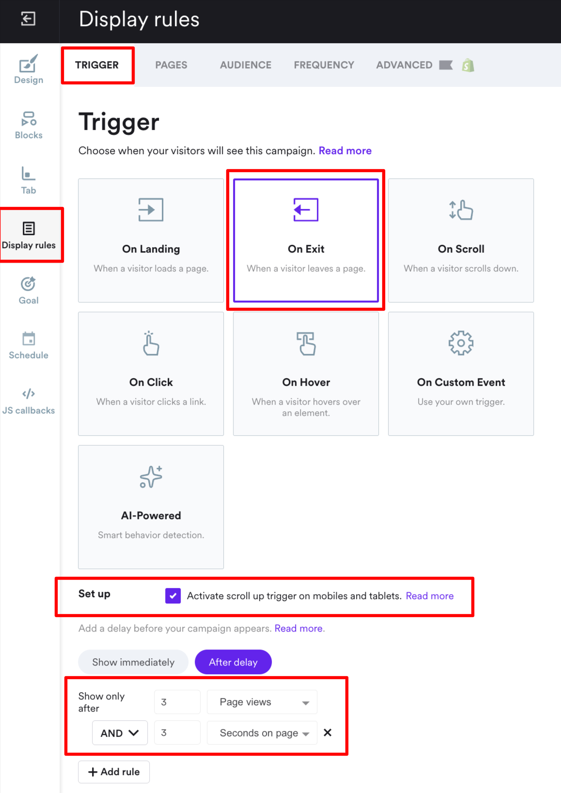 Go to Display Rules to set up where your countdown timer popup appears and to what visitors.