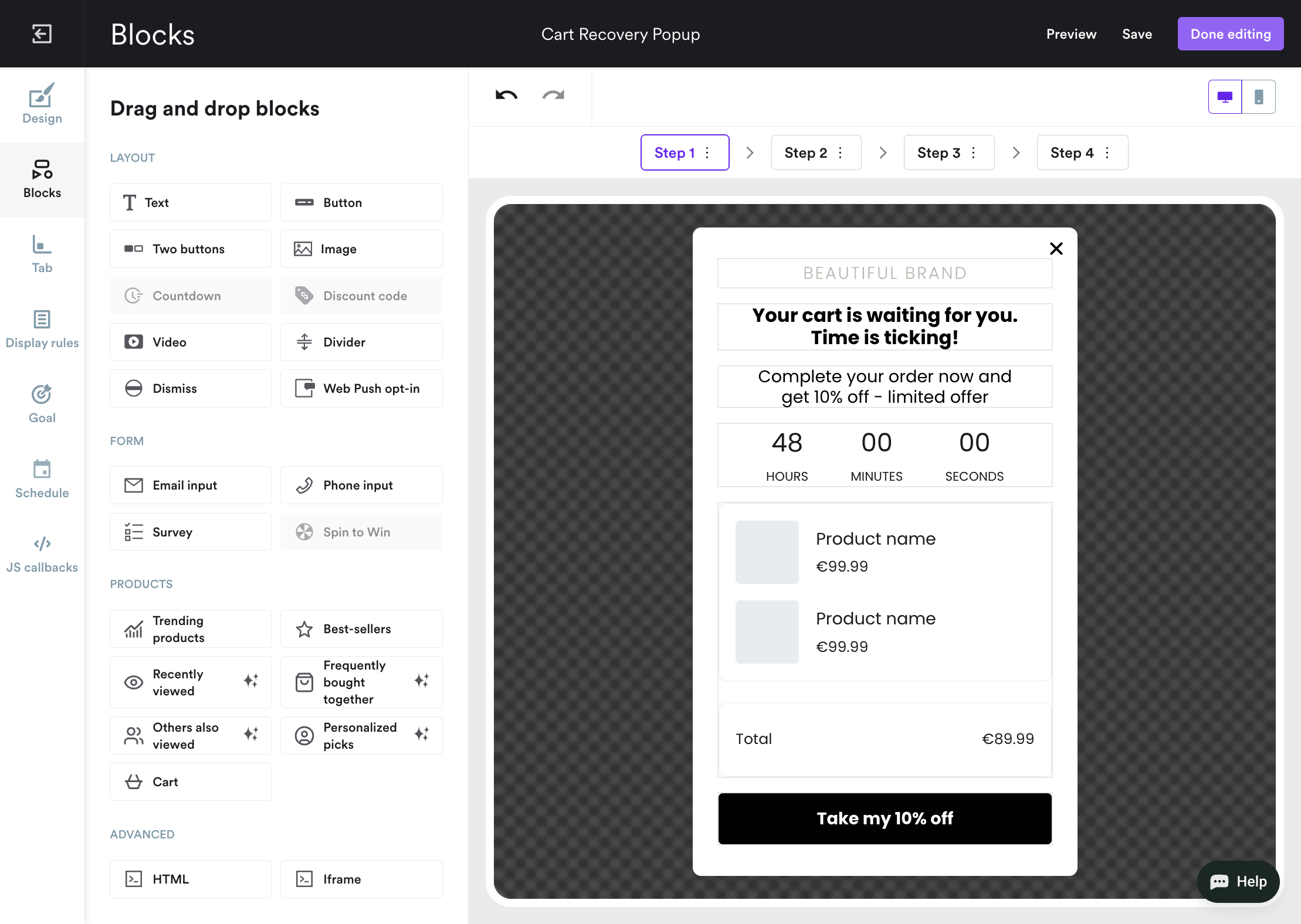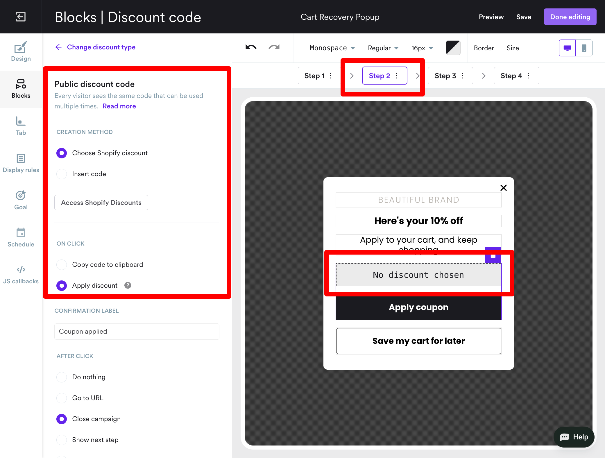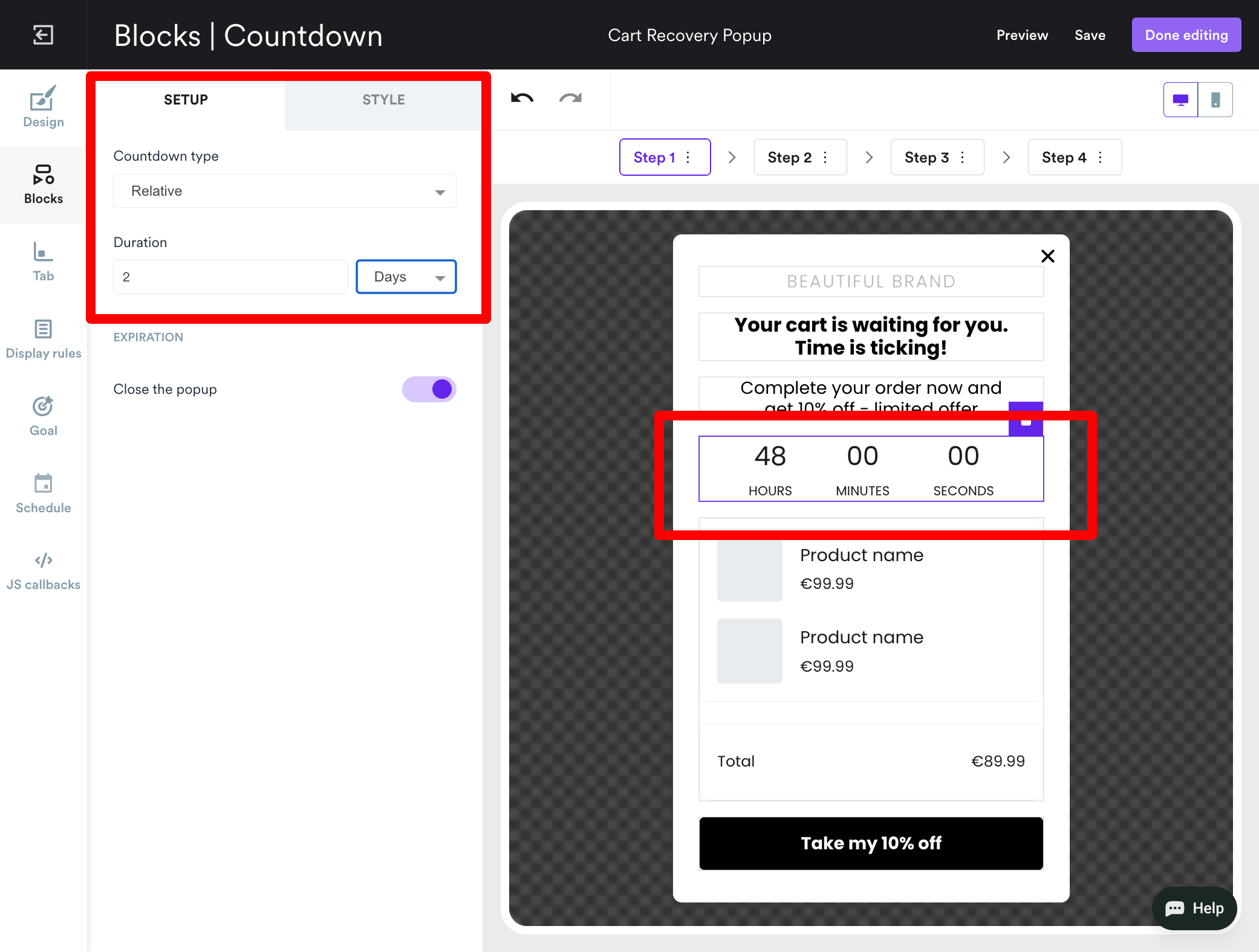 Follow these seven steps to create a cart abandonment countdown timer popup with a limited-time discount as an incentive: