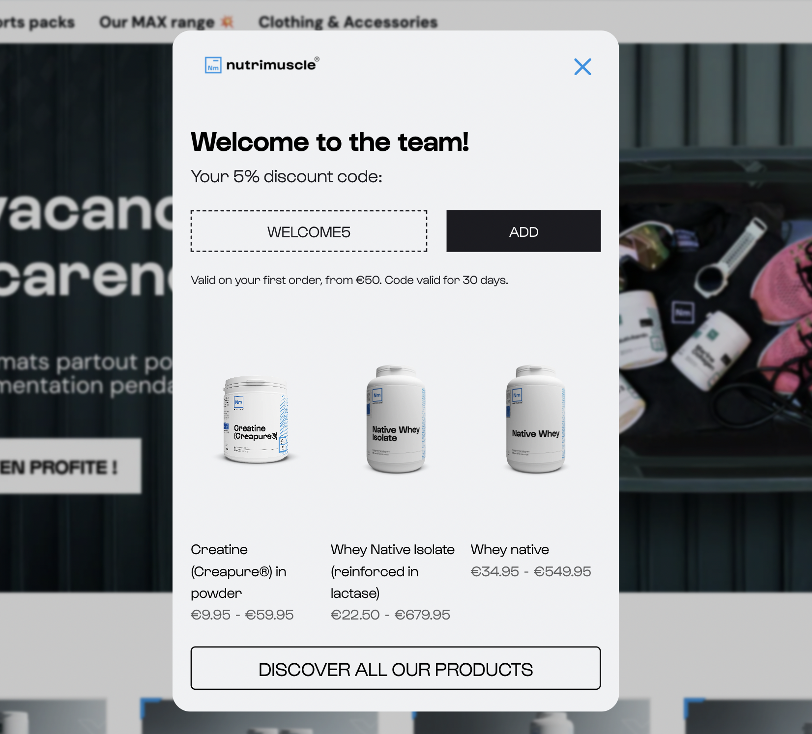 Here’s a branded first-order discount code in a popup from Nutrimuscle (their campaigns convert 4% of visitors):