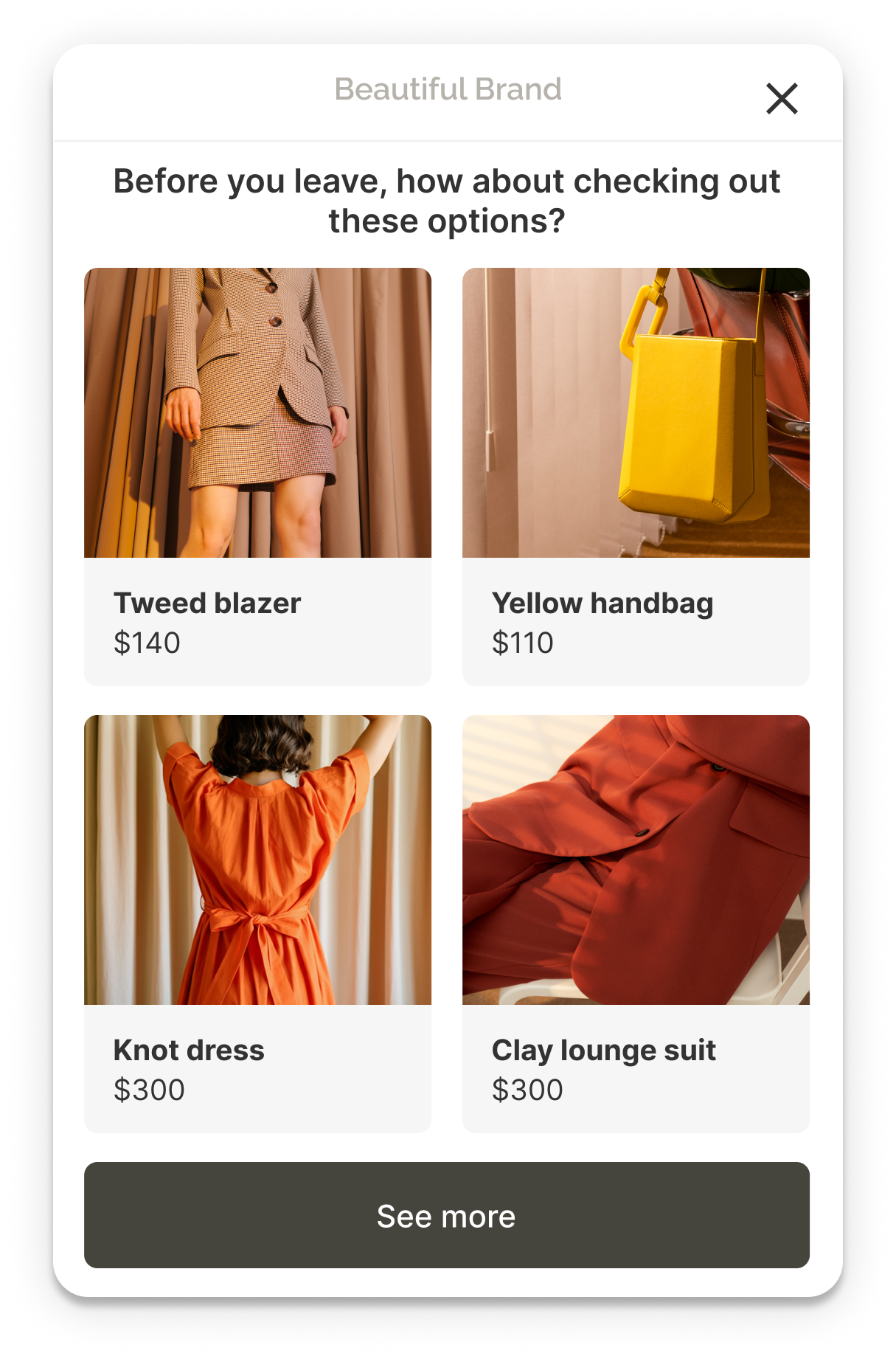 You can create any type of exit popup including traditional formats, signup forms, slide-ins, product recommendations, cart recovery, NPS surveys, and spin-to-win wheels.