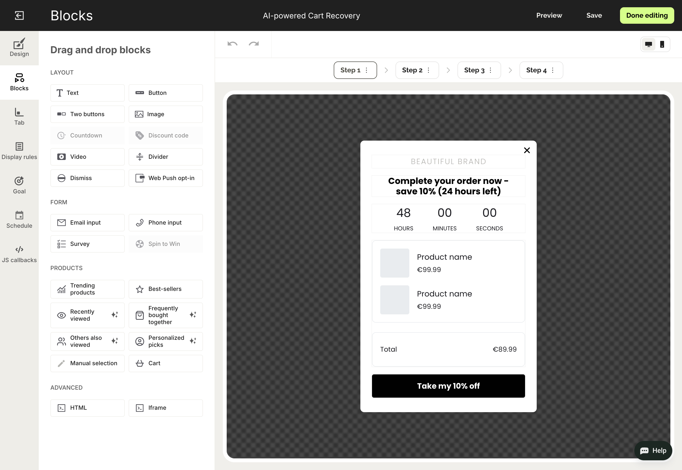 AI product recos, AI cart recovery, AI targeting, multi-step, customer segmentation, page-level targeting