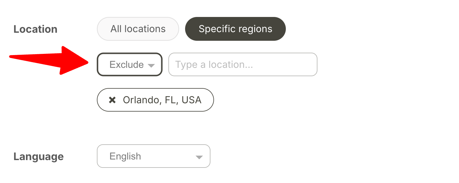 Under Location, switch from "All regions" to Specific regions. Then, type the country or city name in the field and select the correct result from the dropdown.