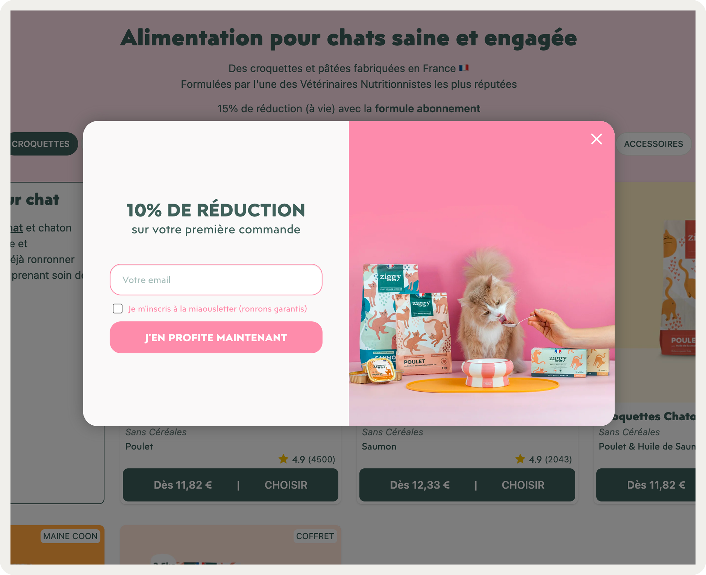 Ziggy, a French pet food brand, runs a French-language email capture popup offering 10% off a first order.