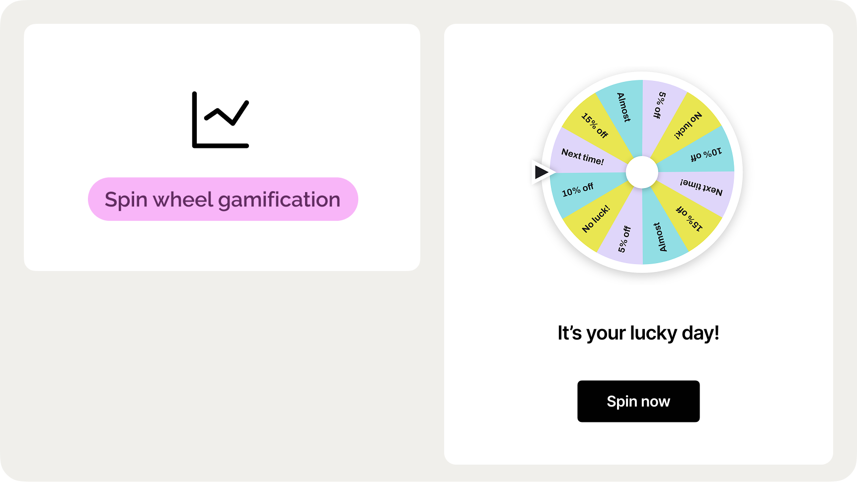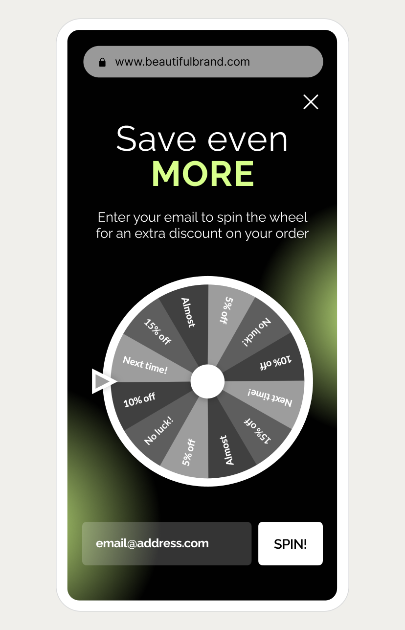 Spin-the-wheel popups (also called pop up wheels and gamified popups) are the popups you’re looking for. They are fun, engaging, and add a bit of excitement to the shopping experience.