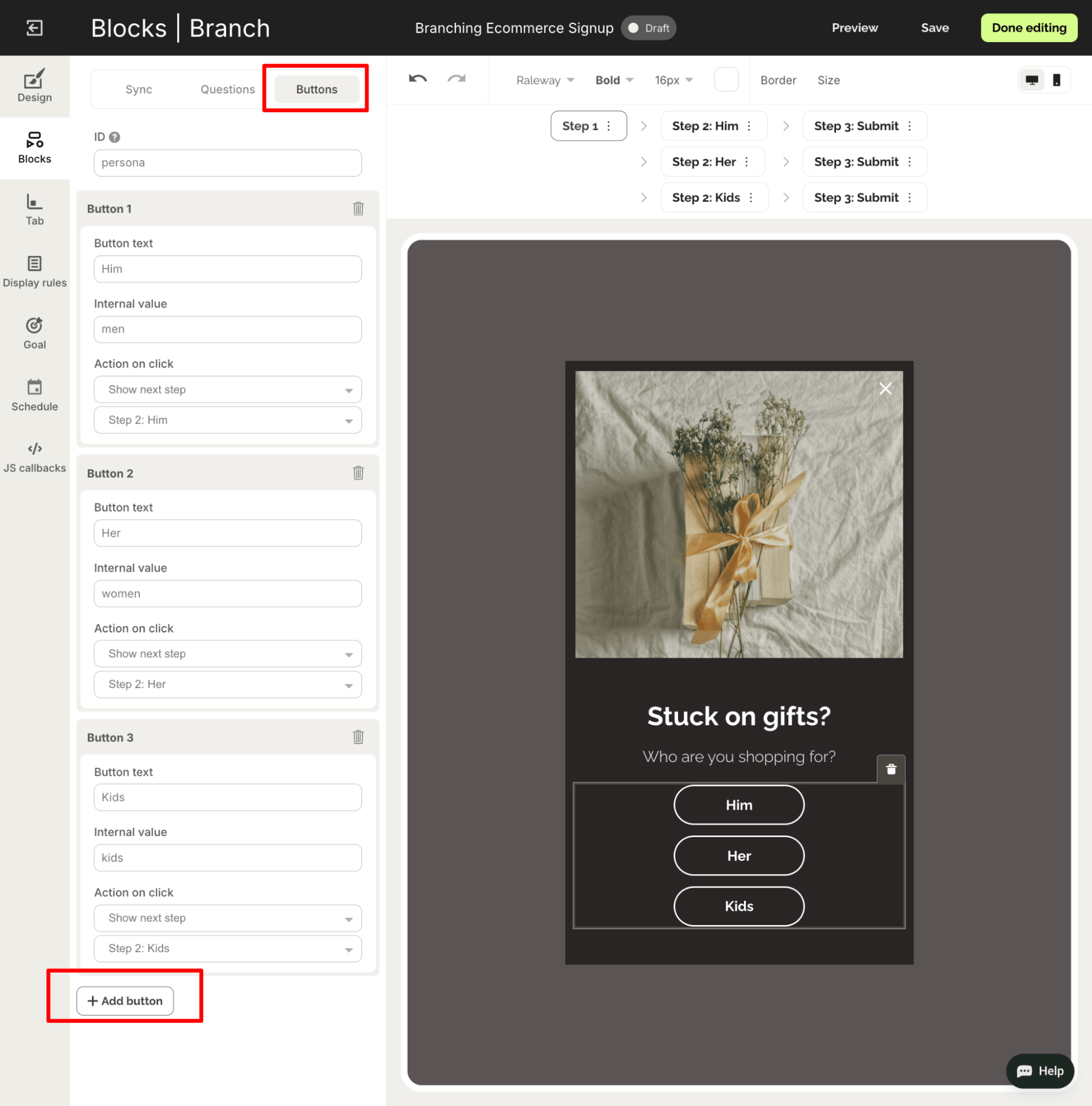 The Branch block comes with two buttons by default, but you can add more by going to the Buttons tab and clicking "+Add button":