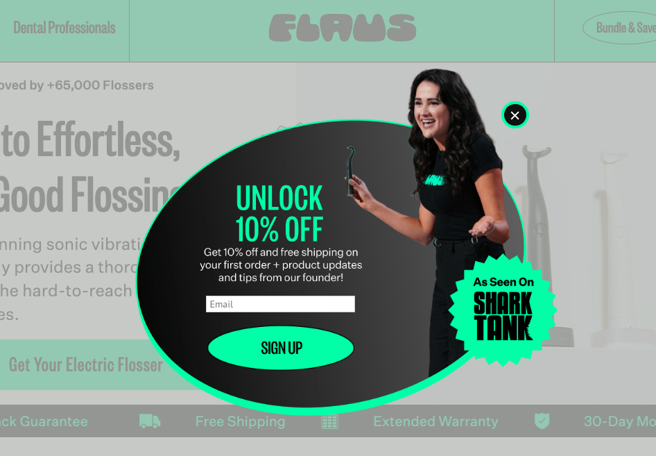 Flaus uses their Shark Tank appearance as the main credibility driver—the badge does heavy lifting without needing additional proof. The neon green design is bold and memorable and is perhaps the main feature of this lead gen popup. The offer (10% off + free shipping) is standard but paired with product updates from the founder, adding perceived value.
