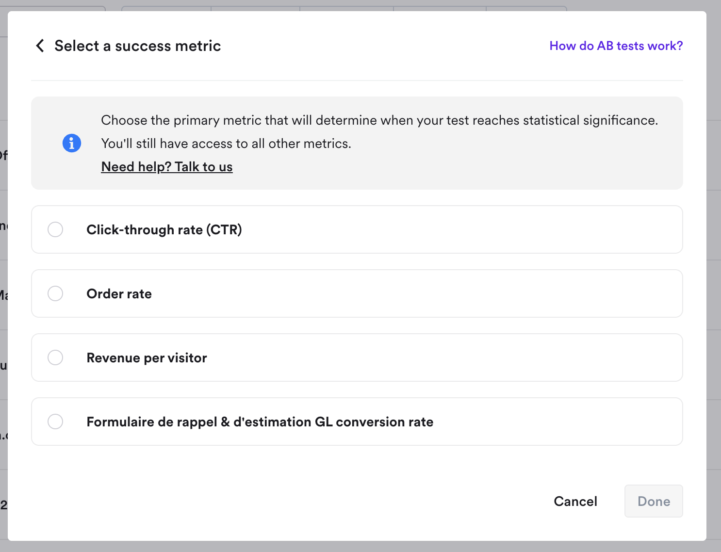 Wisepops, for example, tracks everything automatically—plus, you can choose your primary metrics to focus your A/B tests on: