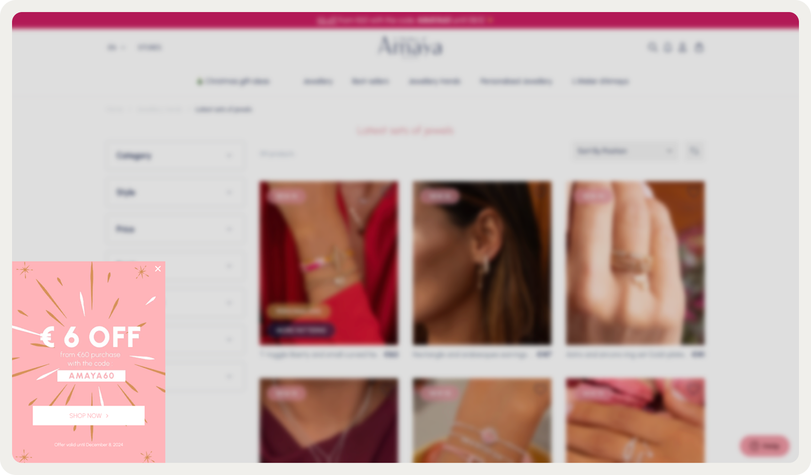 This left-cornered popup (below) at Atelier D'amaya offering a €6 discount for orders over €60 is designed to improve average order value—not capture emails. To make sure that the message is seen, the rest of the screen is blurred (this is the so-called lightbox effect).