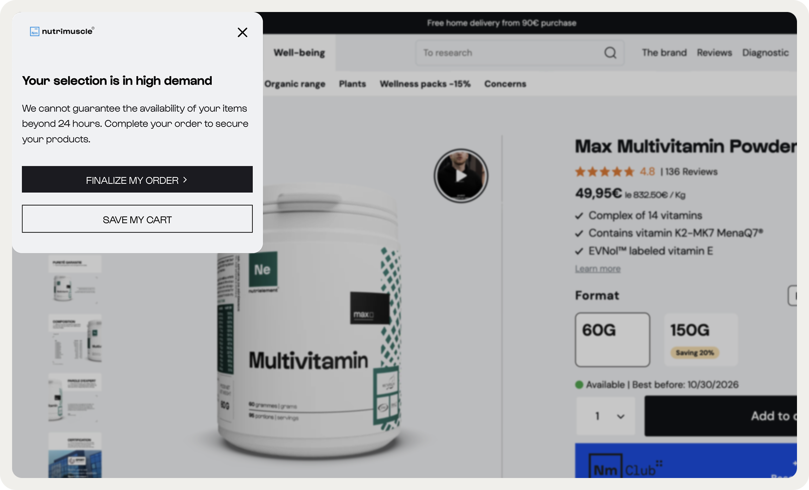 Nutrimuscle achieved 23,970 conversions, partly through A/B testing different incentives in welcome popups. Their three-step popup (email > phone > sport type > instant discount code +bestseller recommendations) was a part of the strategy that generated 7,600+ email leads with a 5.7% average CTR.
