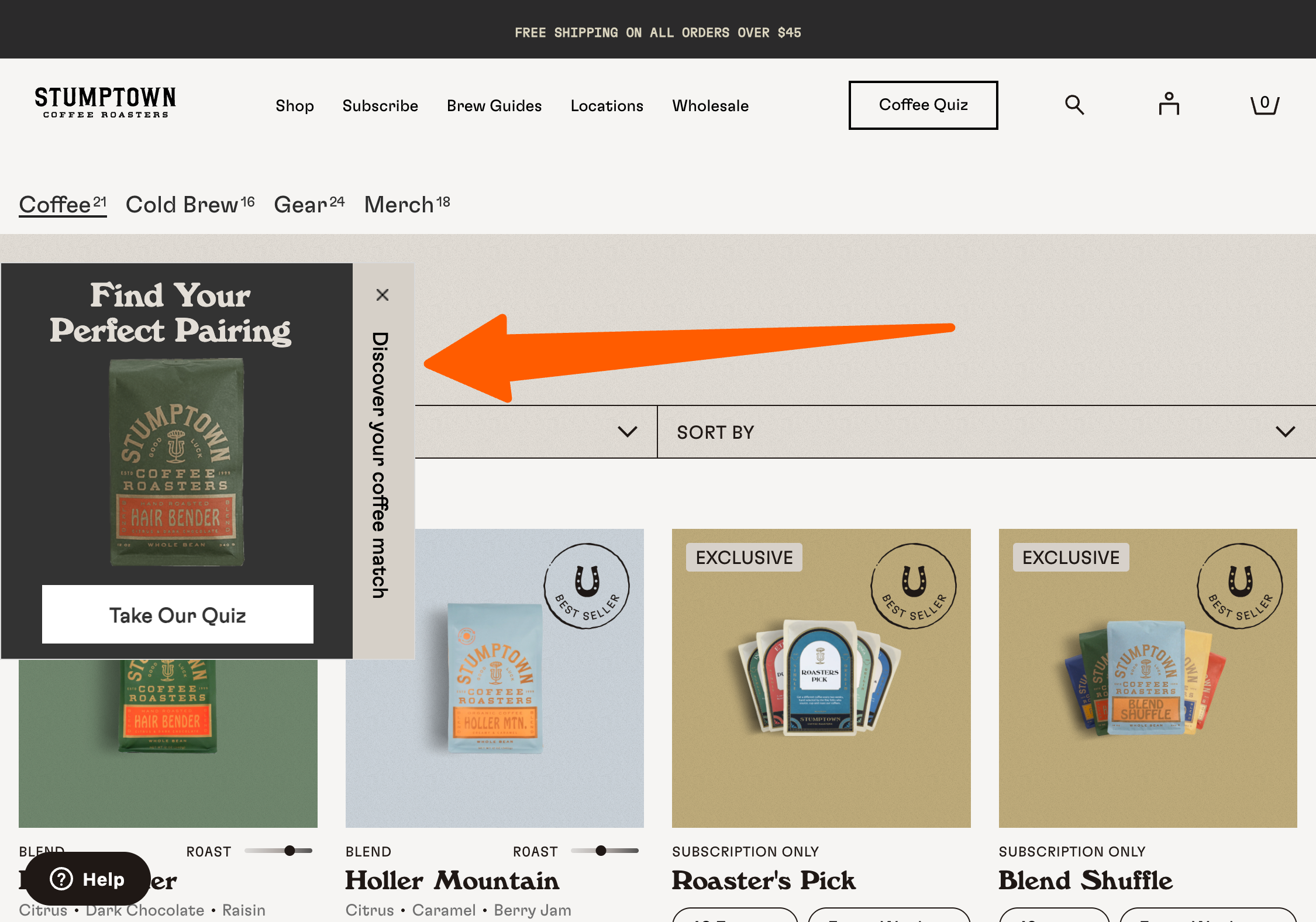 This campaign guides visitors to a product quiz to help them choose the best coffee blend based on their preferences. It appears only on product pages to ensure relevancy: