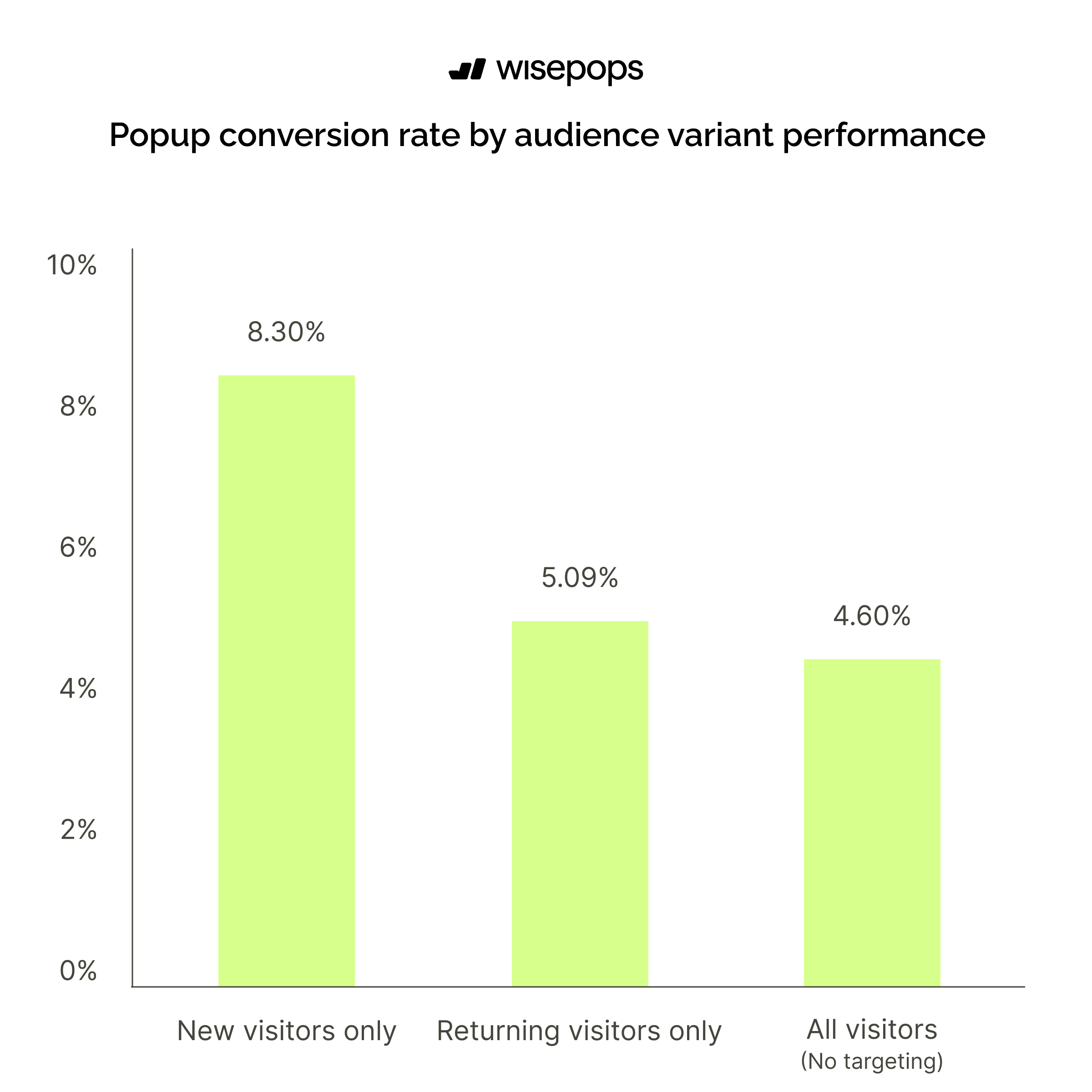 Popups targeting new visitors only achieve an 8.30% conversion rate, while returning visitor campaigns convert at 5.09% and untargeted popups shown to all visitors convert at 4.60%.