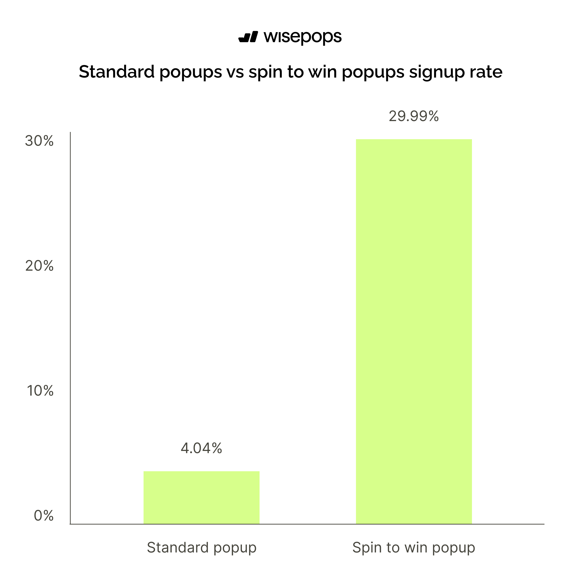 Spin-to-win popups achieve an extraordinary 29.99% conversion rate, which is 642% higher than traditional popups at 4.04%.