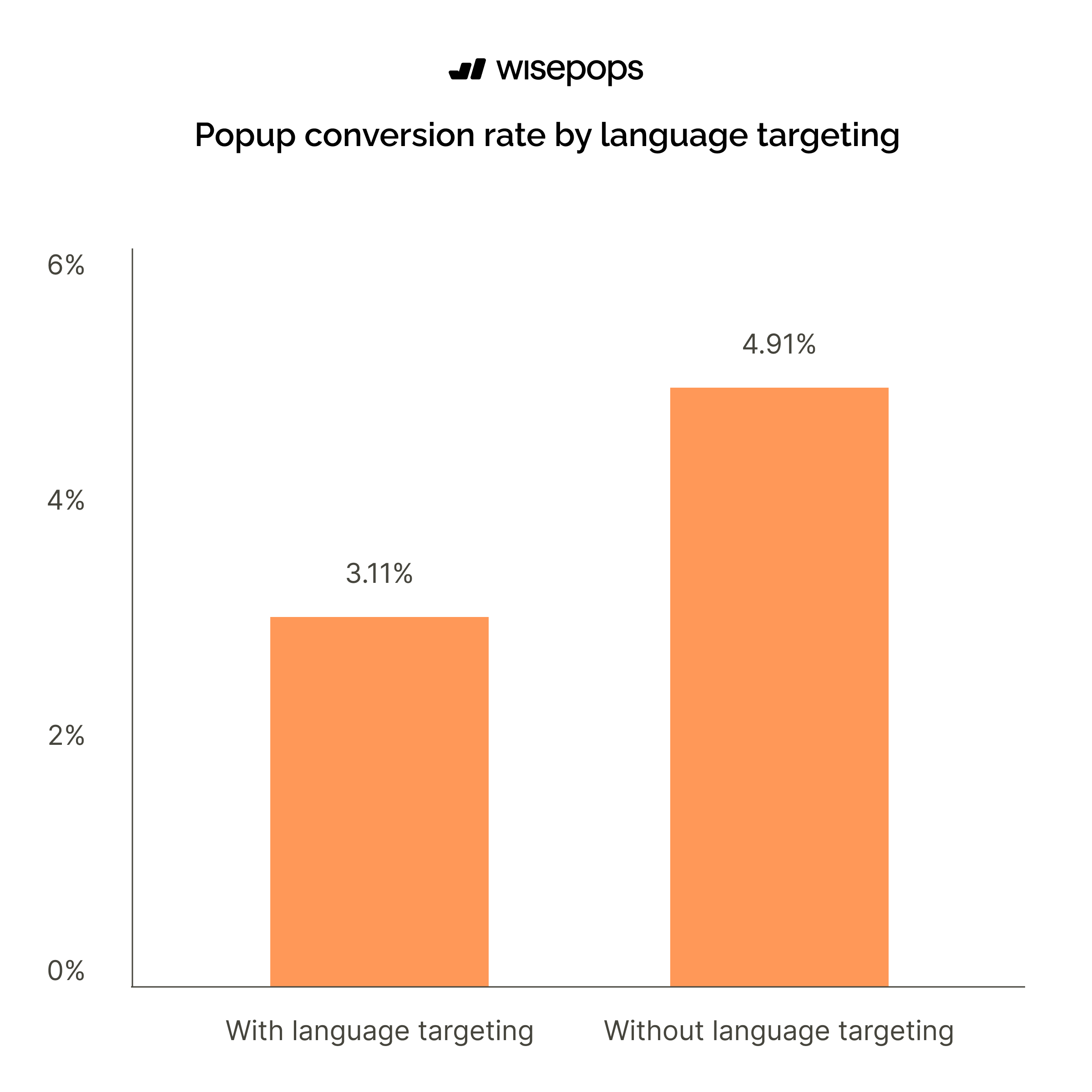 Popups without language targeting achieve a 4.91% conversion rate, while those with language targeting convert at 3.11%.
