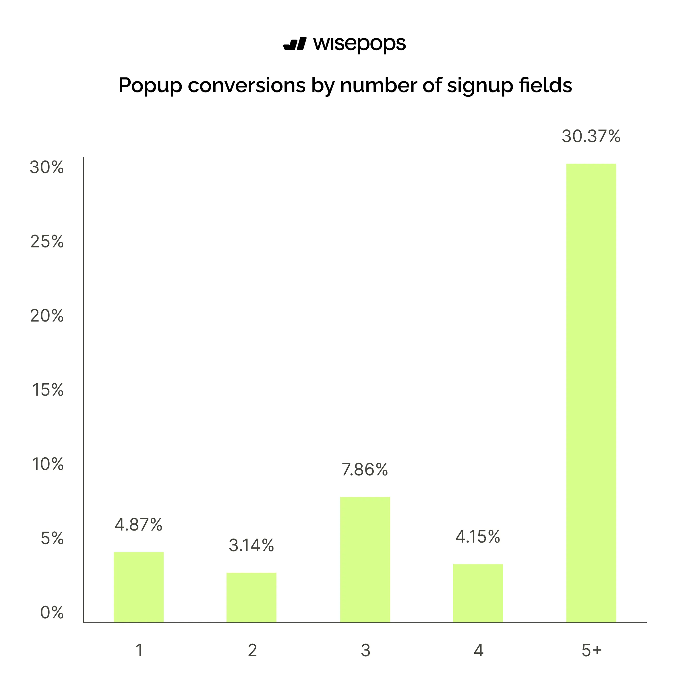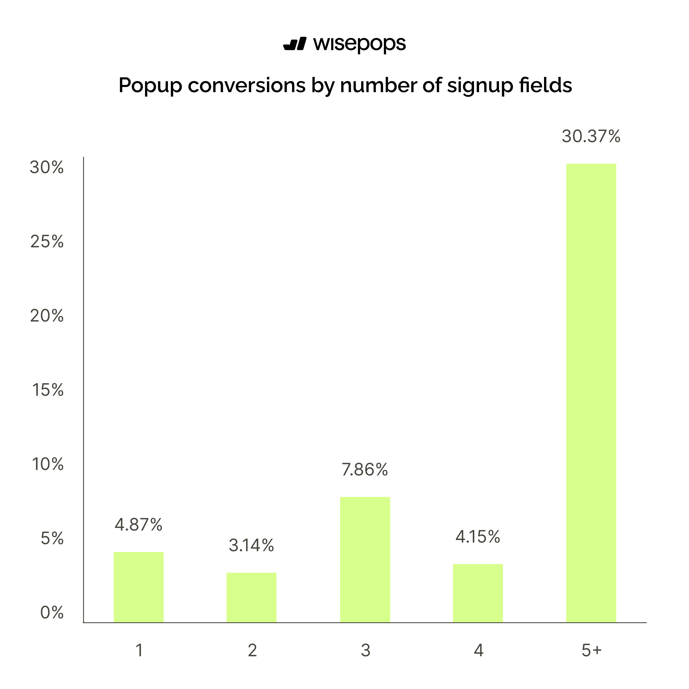 Interestingly, 5-field popups achieve an exceptional 30.37% conversion rate with a massive 528.7% increase, though this likely applies to highly qualified traffic or specific use cases. The data suggests that finding the optimal number of fields depends on your audience and offer.