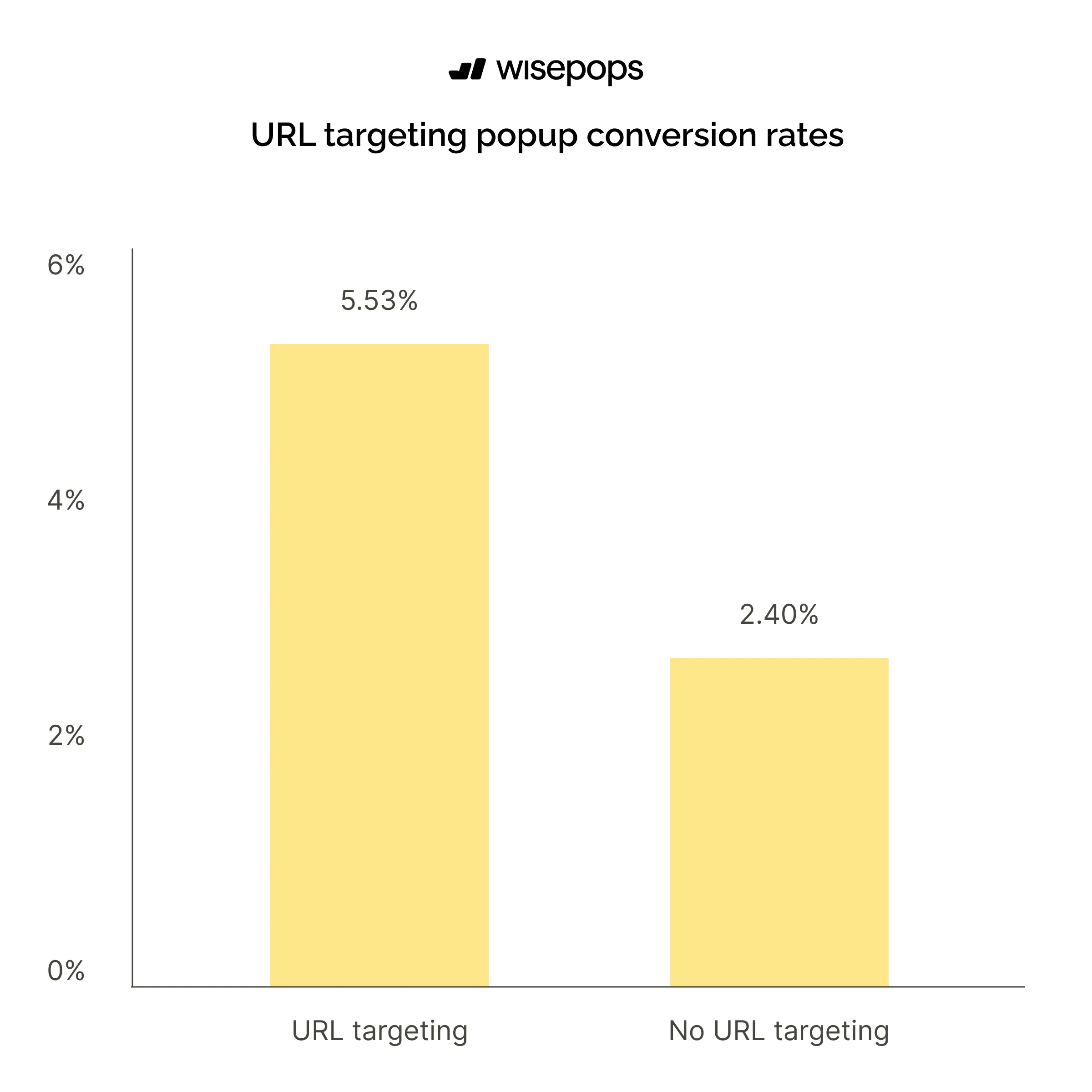 Popups with URL targeting achieve a 5.53% conversion rate, which is 130% higher than popups without URL targeting at 2.40%.