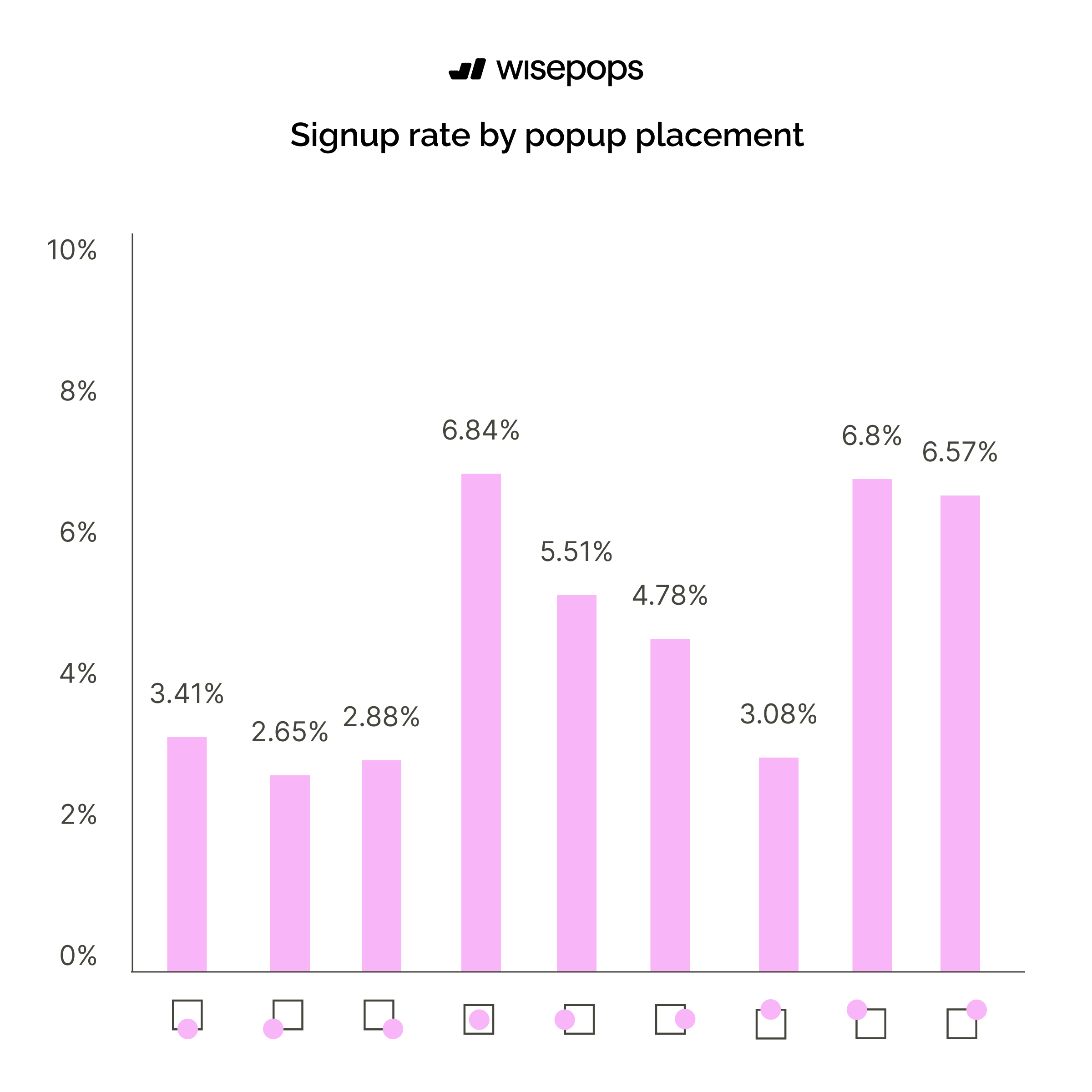 Center-positioned popups achieve the highest conversion rate at 6.84%, followed closely by top-left at 6.80% and top-right at 6.57%, demonstrating that prominent, centrally-placed popups that command visitor attention perform best.