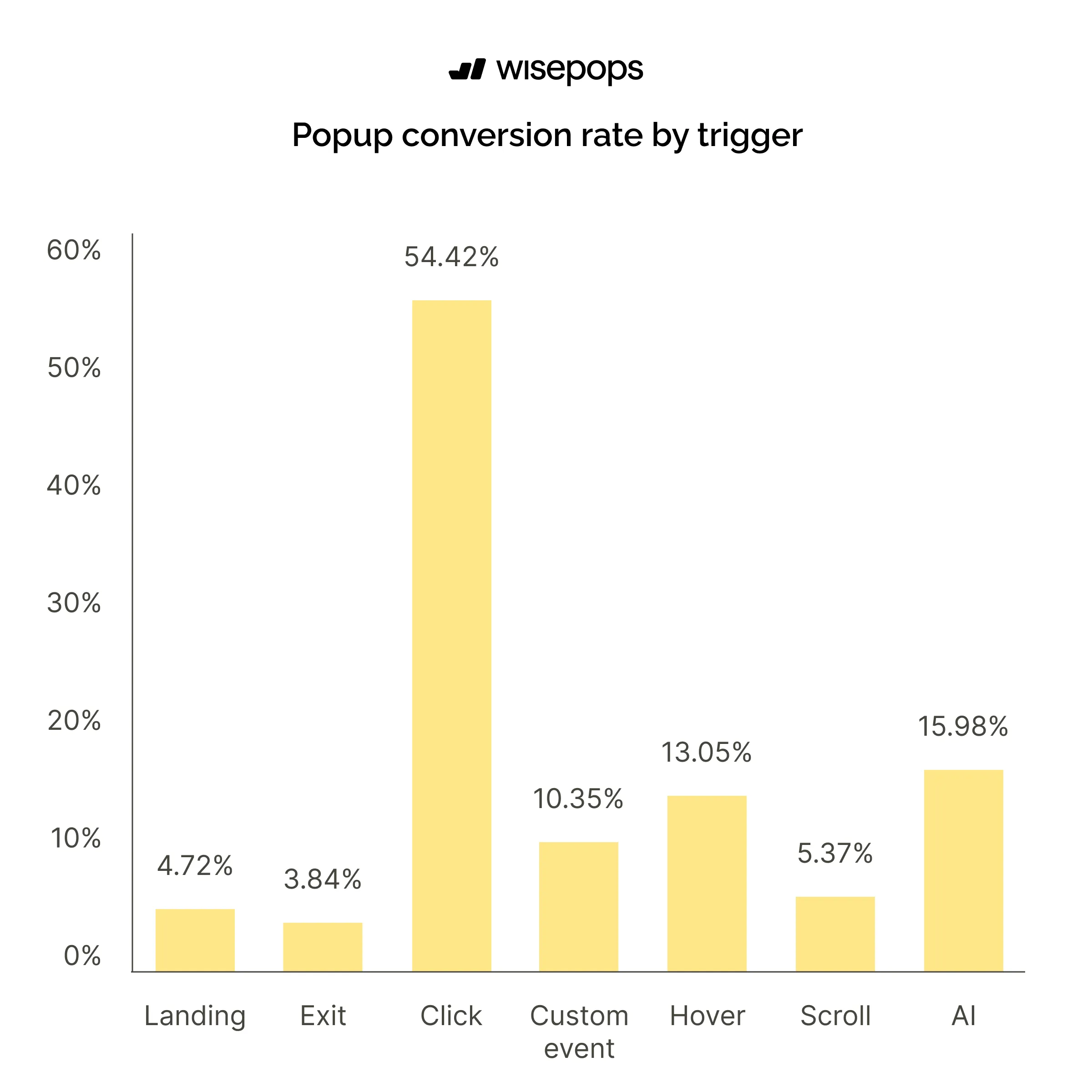 Click-triggered popups achieve an exceptional 54.42% conversion rate, making them the most effective popup trigger by far, s visitors who actively click on an element have already signaled their interest and intent, making them pre-qualified leads who are more likely to complete the conversion