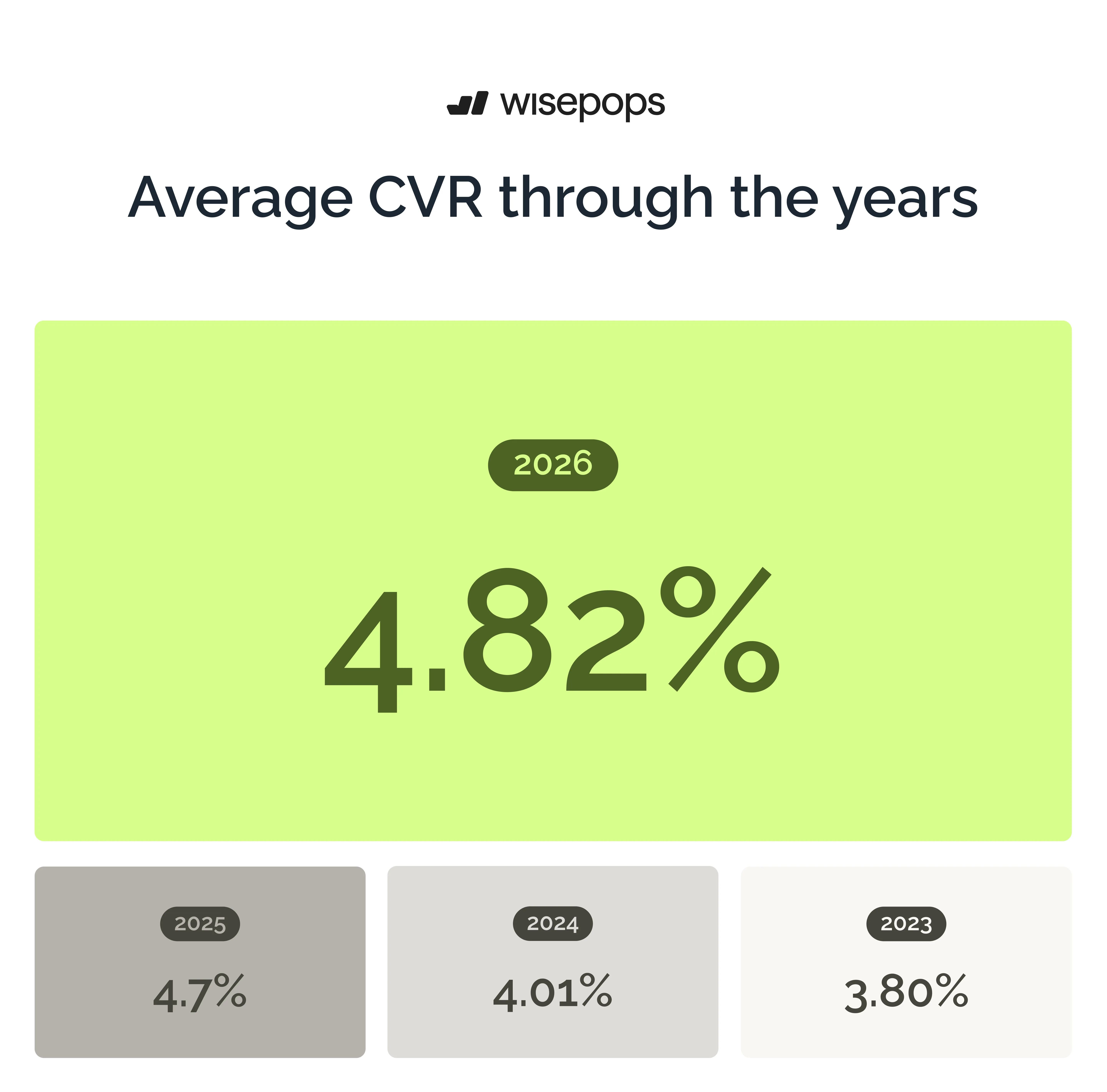 The average popup CVR in 2026 is 4.82%, but we took a deep dive into all the factors that could influence this performance—both general ones like the trigger or whether the visitors were new or returning, whether a discount code was used, as well as more advanced options such as delay, on-page position, geolocation, etc.
