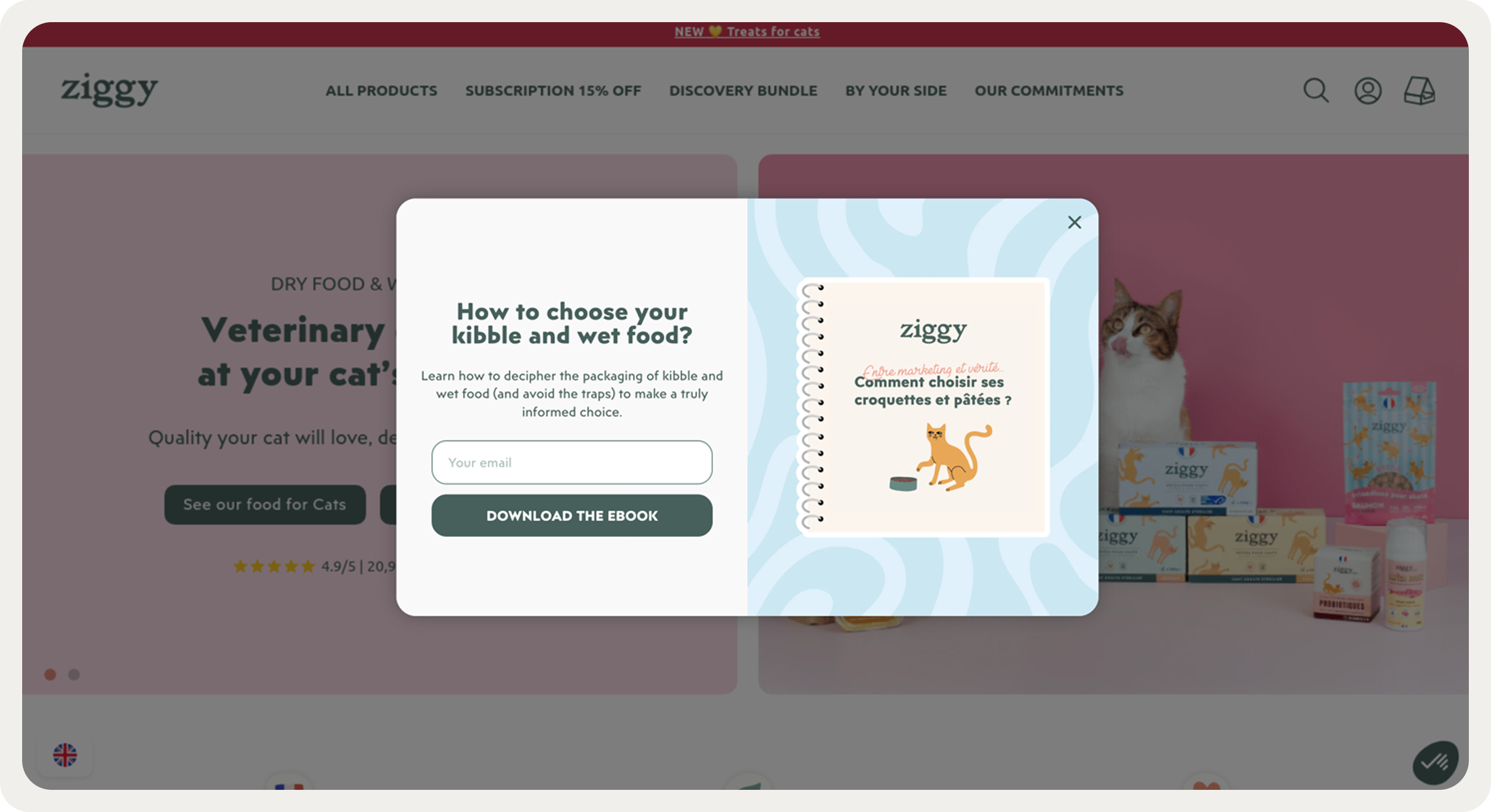 Ziggy, a French cat food brand, uses a popup offering a free ebook ("How to choose your kibble and wet food?") with a short description that sets expectations: learn how to read packaging and avoid marketing traps to make an informed choice.