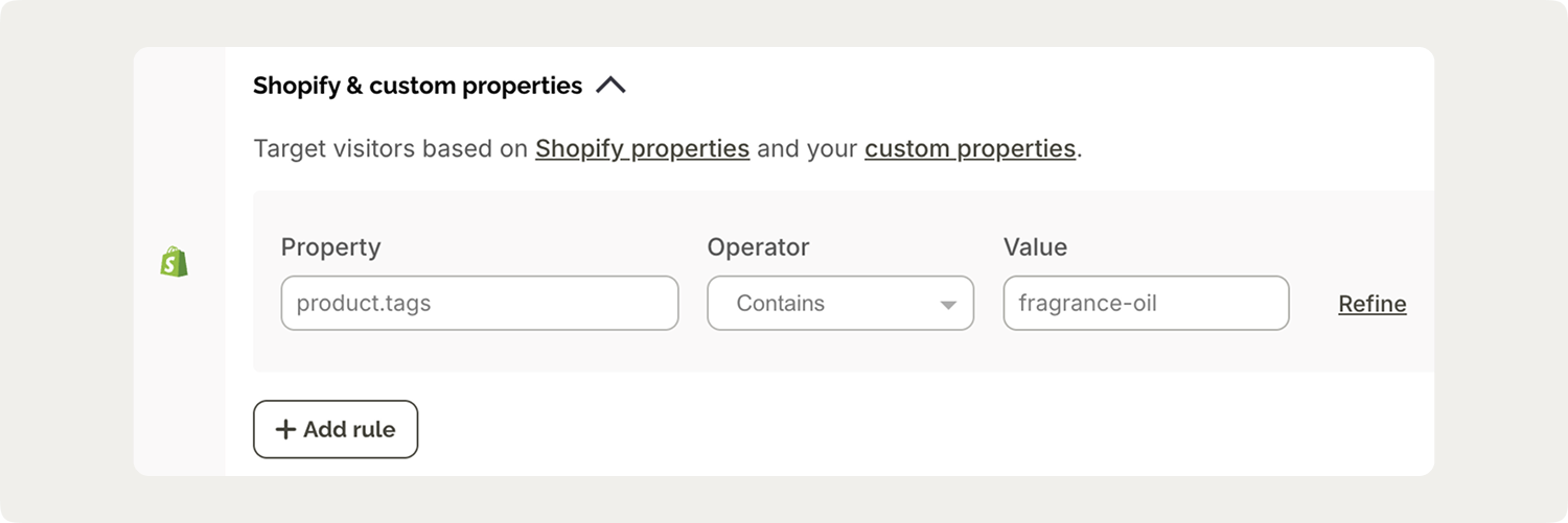 This is where Shopify's native tagging system becomes powerful for targeting. If you tag all your oil products with "fragrance-oil" in Shopify, you can target all those products in Wisepops with a single rule: