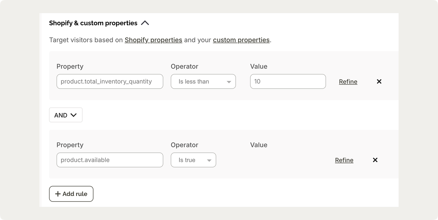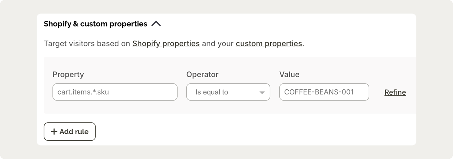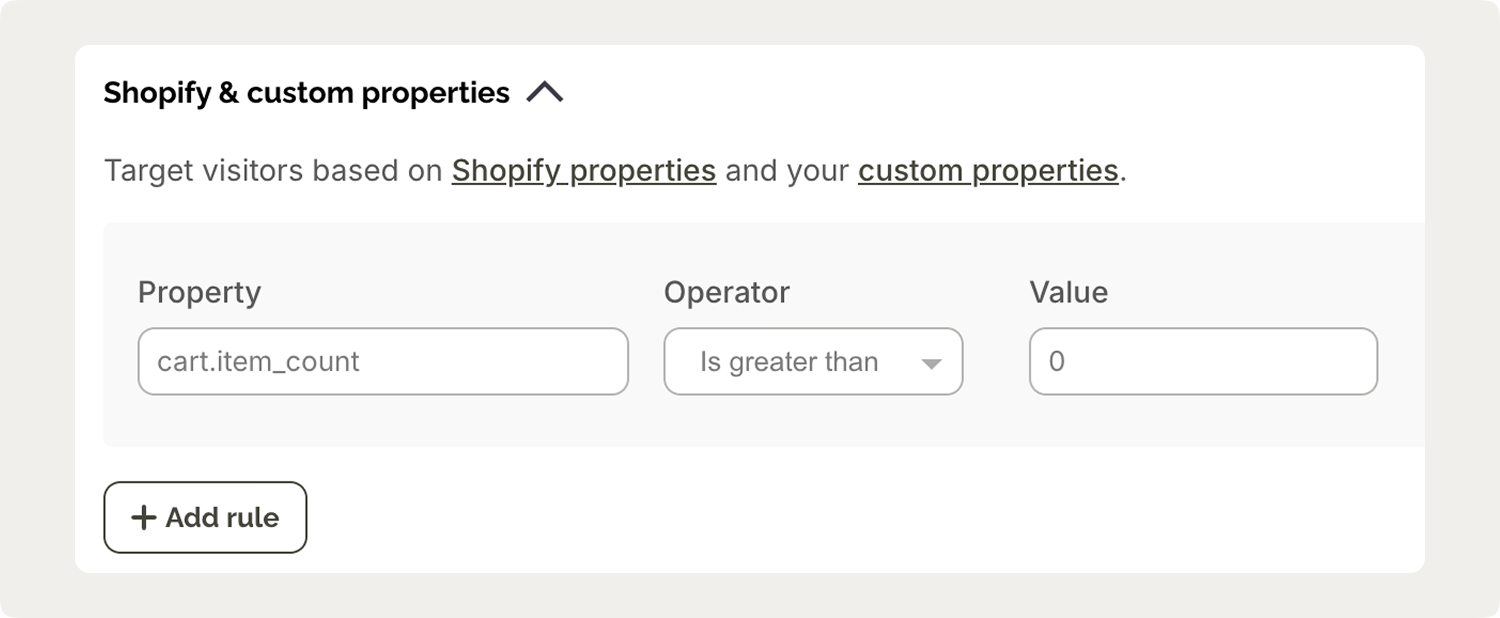 Cart properties update in real-time as customers add or remove items, which means your popups can respond to shopping behavior as it happens rather than showing generic messages to everyone.
