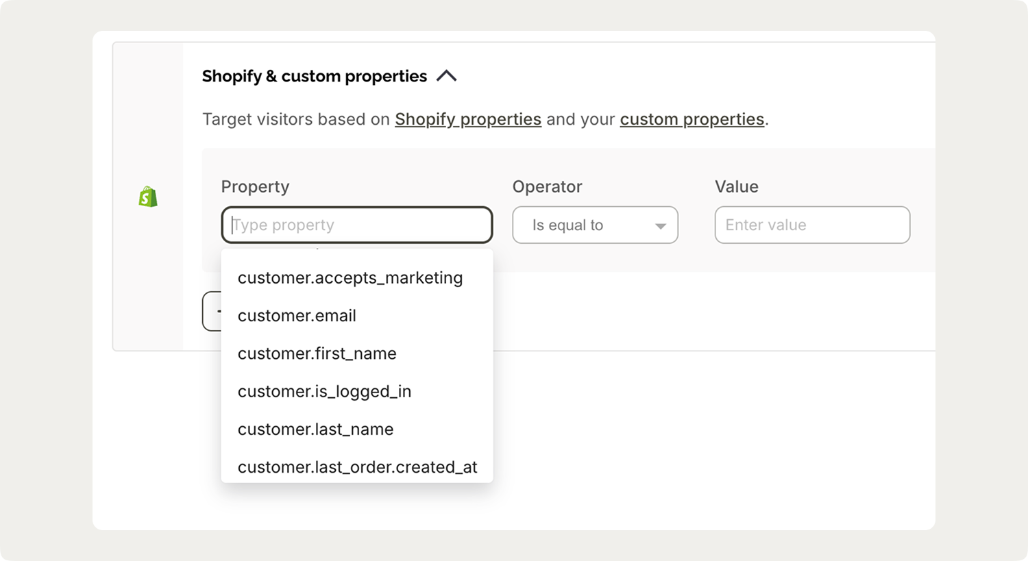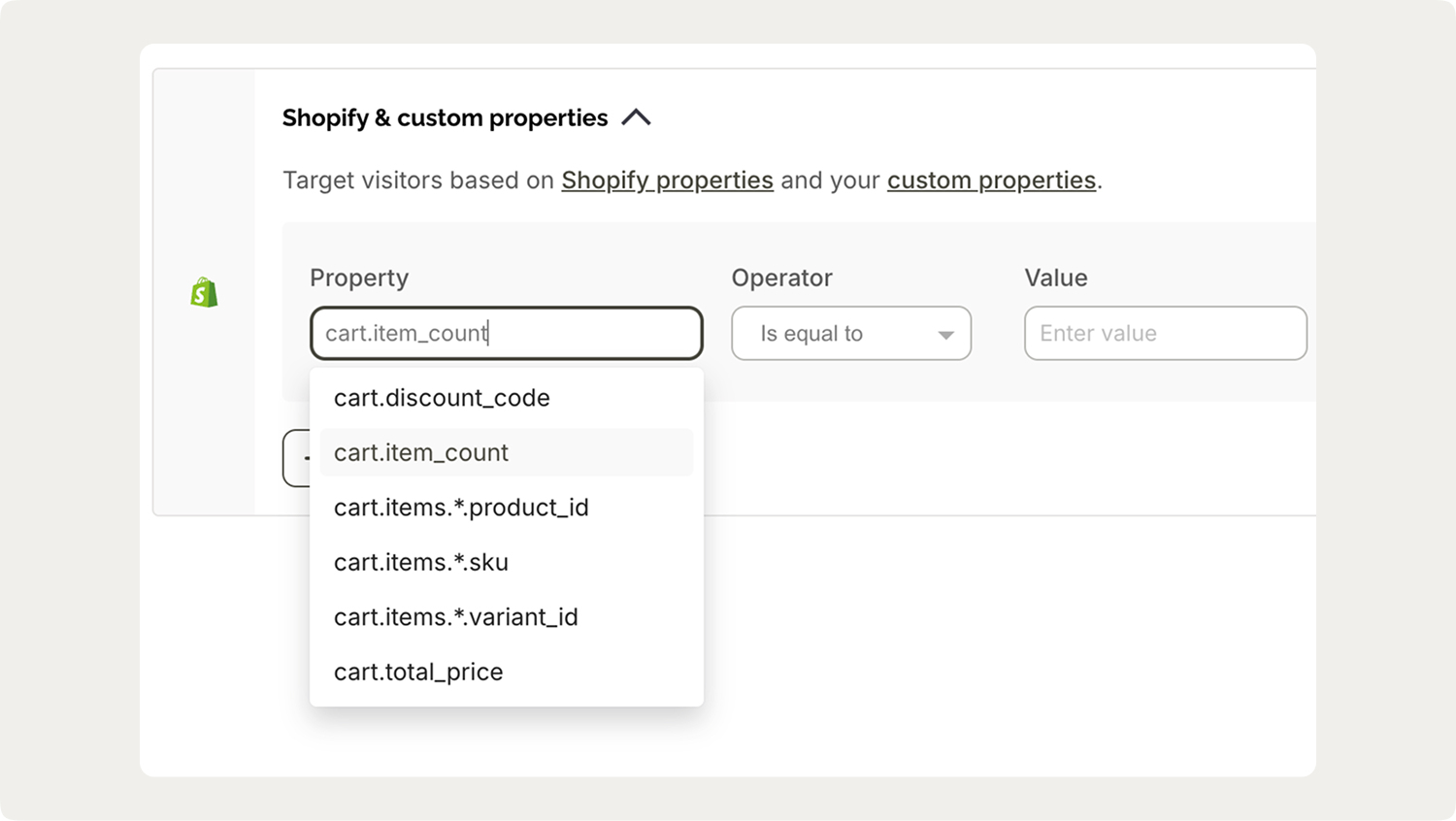 This is the most commonly used Shopify property for onsite campaigns. The classic use case is the free shipping threshold popup—if you offer free shipping at $50, you target visitors whose