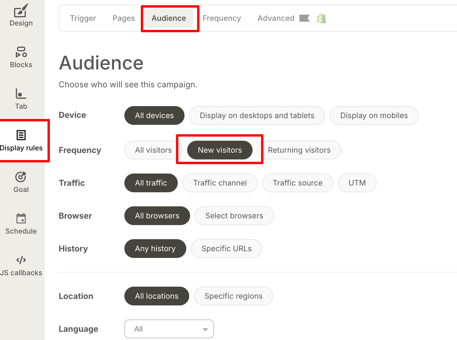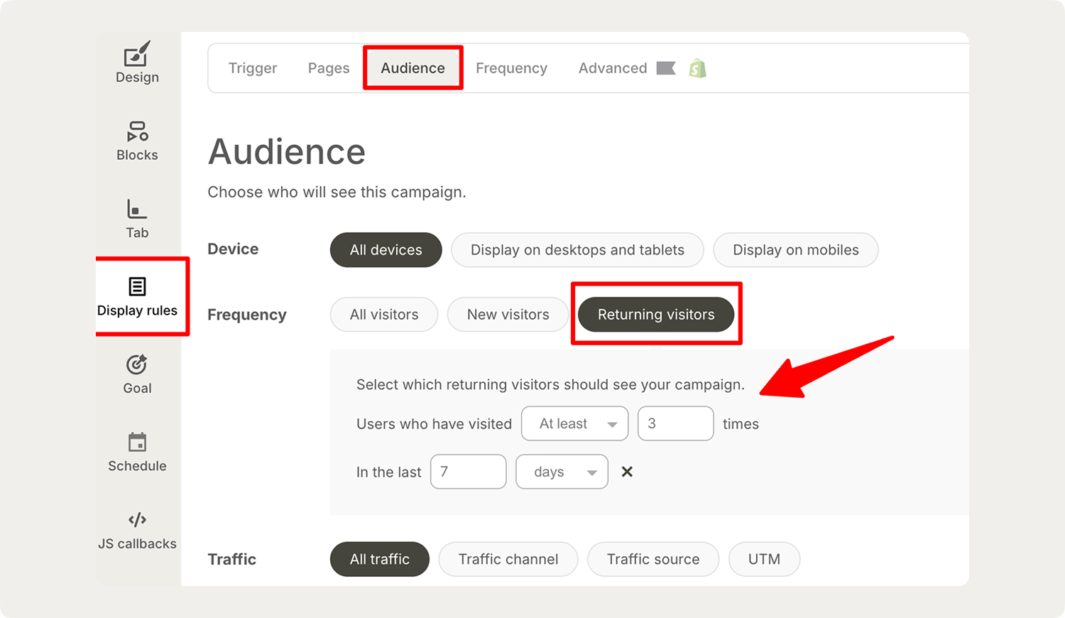 You can access this in the Audience tab under "Frequency." The delayed trigger ensures you're not interrupting them immediately upon arrival, but you're introducing your brand before they reach product pages.