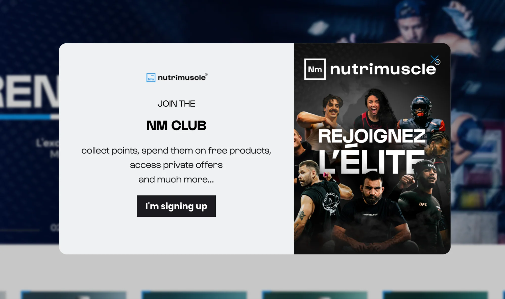 Nutrimuscle uses powerful imagery showing their sponsored athletes and fitness ambassadors alongside "Join the NM Club" messaging. Among them—Benoit Saint Denis, a known UFC fighter, and Prescillia "Lya" Bavoil is a powerlifter and two-time World Champion.