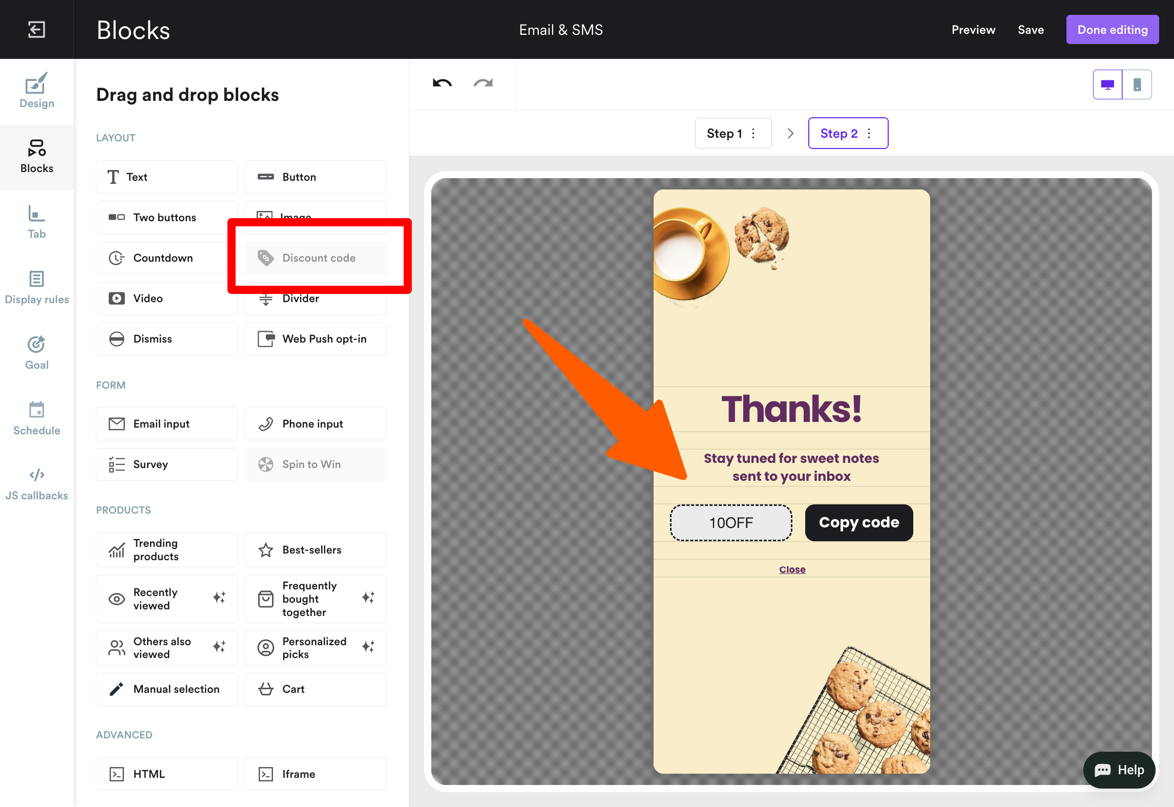 Go to Step 2 (shown above the campaign preview). Choose the discount block, drag it onto your template, and add the code.