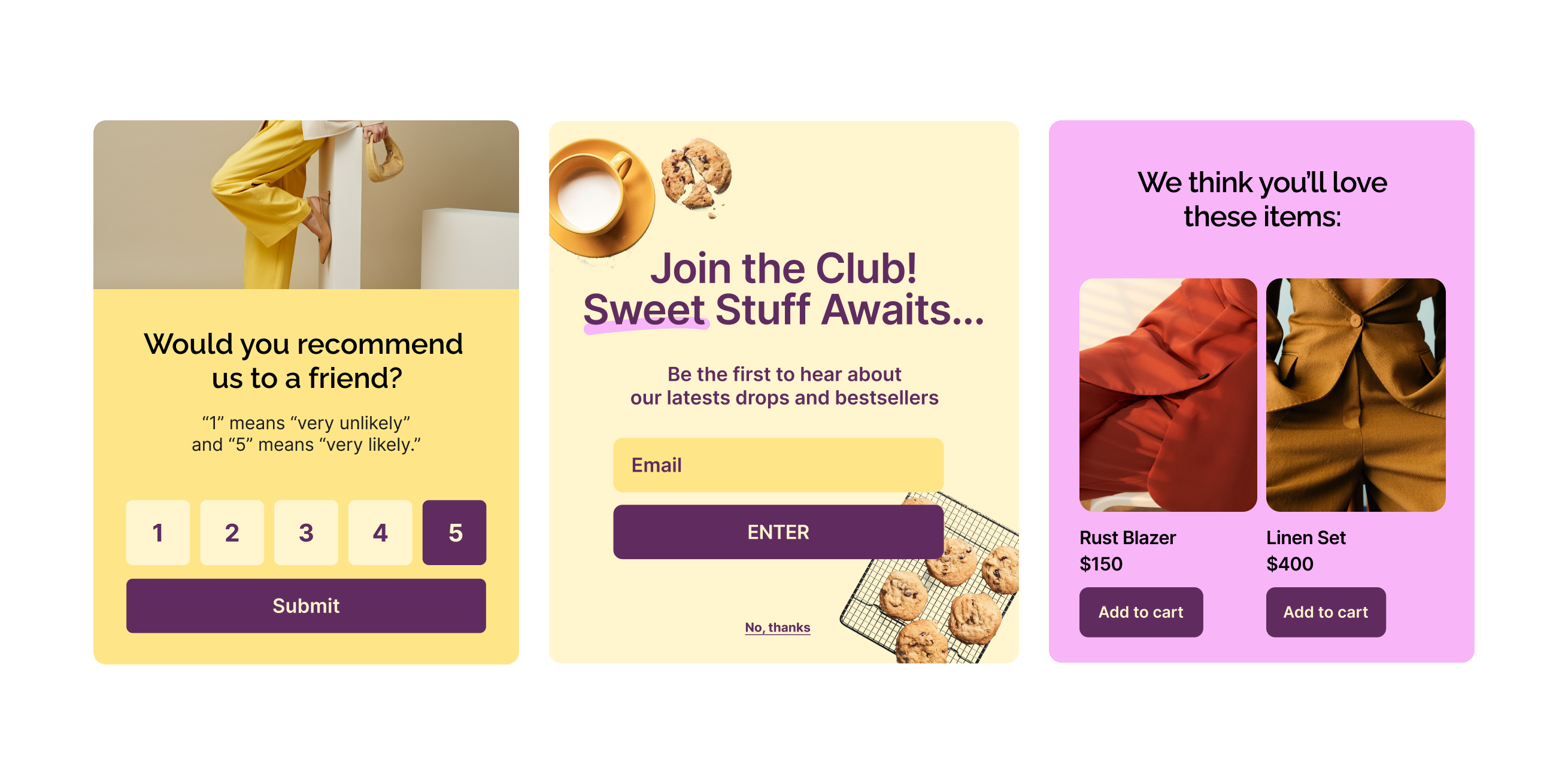 Survey popups. These gather customer data like product preferences or feedback through simple yes/no questions or multiple-choice questions.