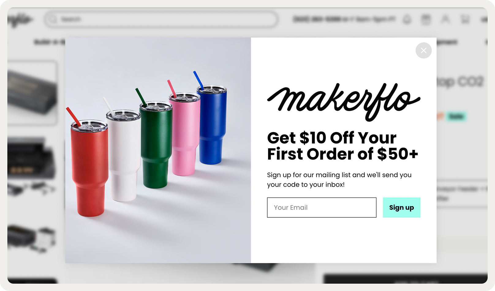 Makerflo's welcome popup copy is a great example of the value-driven copy: it goes straight to the point— sign up with an email for $10 off orders over $50. By setting a $50 minimum, the brand is nudging first-time buyers toward a higher order size.