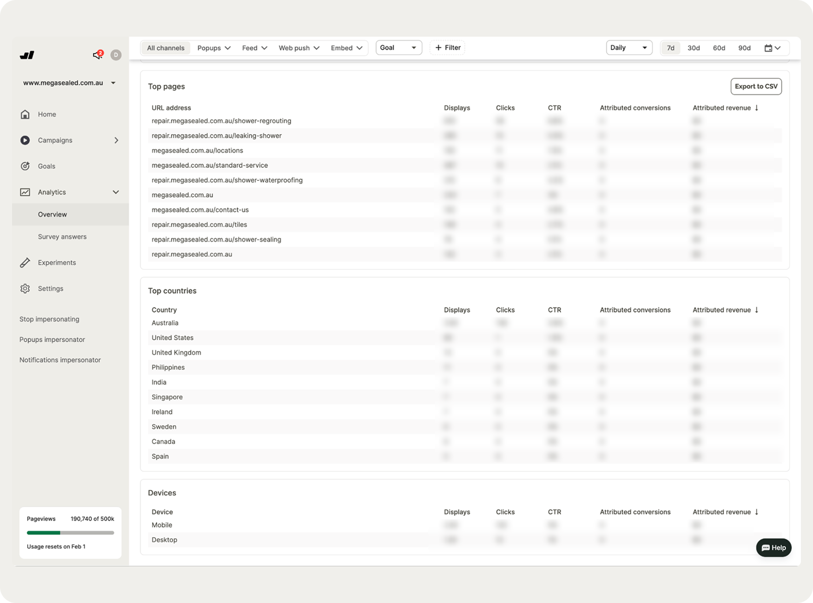 The analytics dashboard shows performance across every site: displays, conversions, CTR, revenue attributed, broken down by device, page, and geography — all in one place, without pulling data from multiple sources.