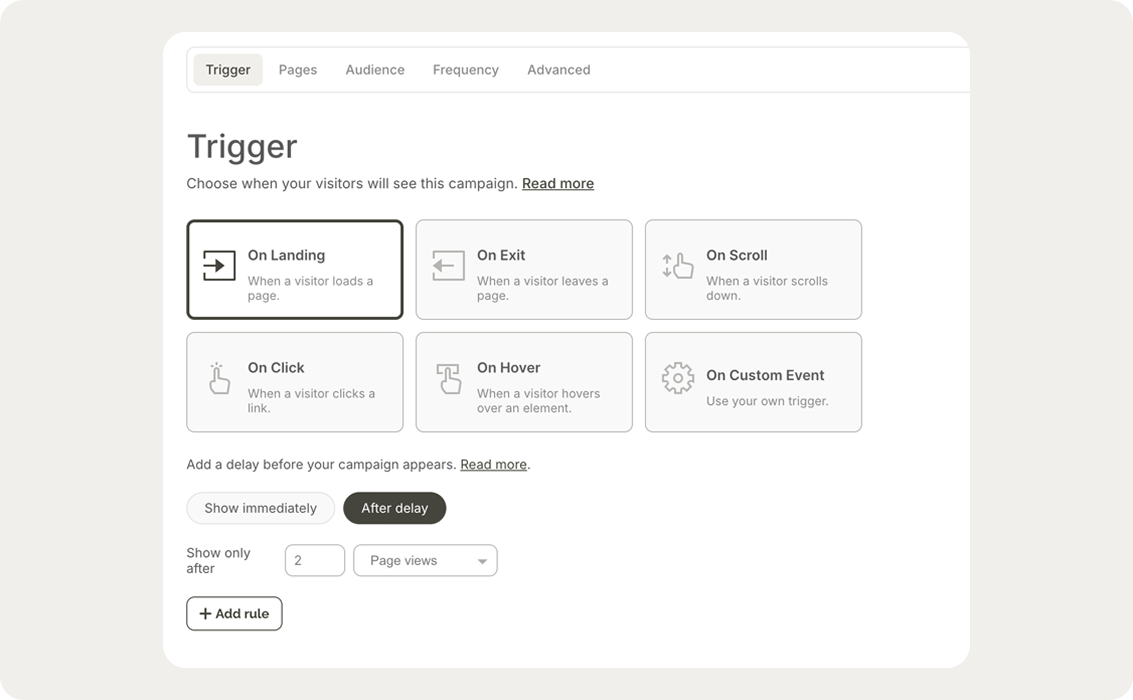 It controls exactly where a campaign appears, using URL matching (contains, starts with, exact). You can exclude pages as well — a common use case is suppressing lead capture campaigns on checkout or account pages where they'd create friction.