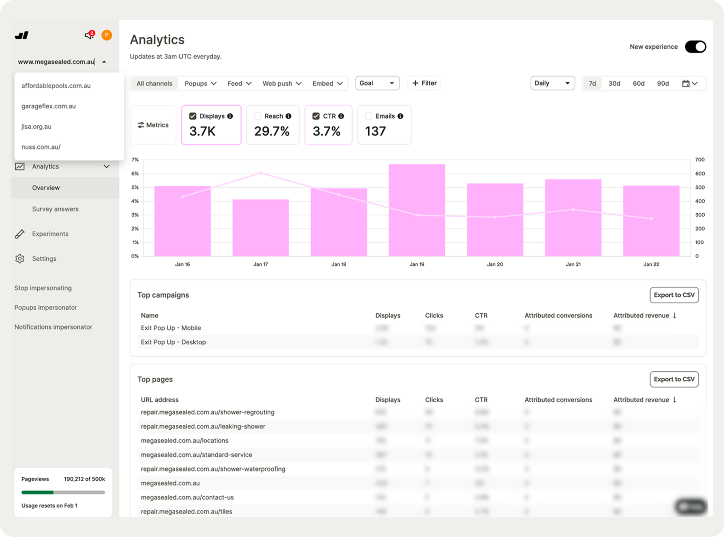 All client websites are managed from a single Wisepops workspace. From the dashboard, you can navigate between sites, monitor campaign performance across the whole portfolio, and spot what's working and what needs attention — without logging in and out of separate accounts.