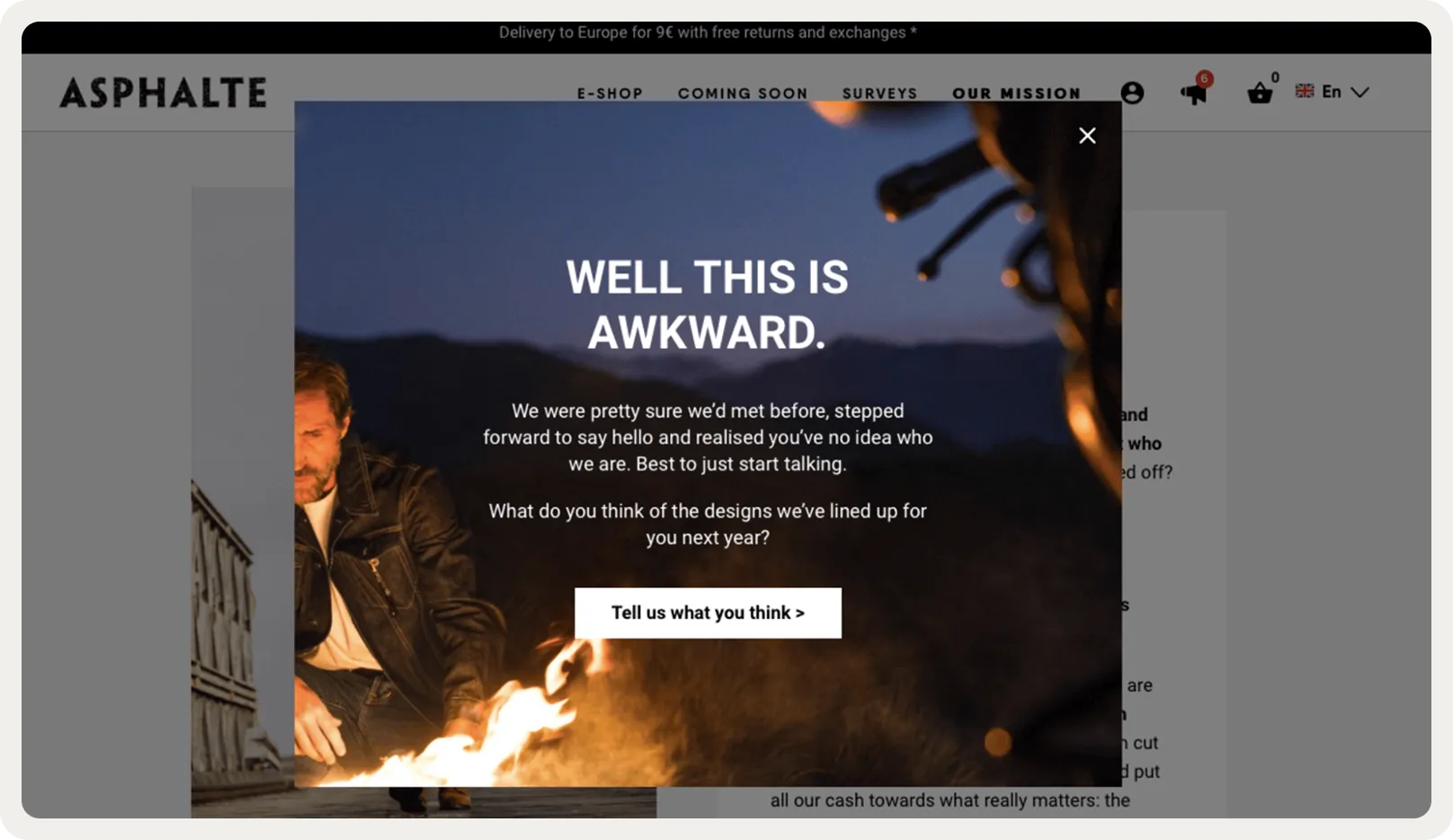 Asphalte's team launched a campaign designed to introduce new visitors to the brand’s unique approach. To drive traffic to their product survey, they launched a time-triggered popup shown after 30 seconds to first-time visitors. This campaign invites users to help shape future fashion trends—making for a memorable brand introduction.
