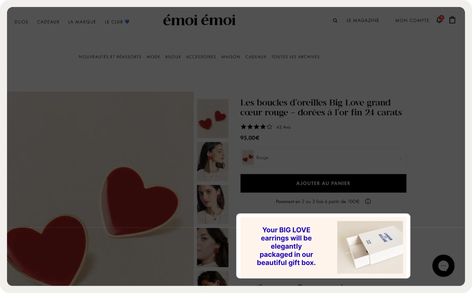 To enhance the average order value, émoi émoi implemented effective upsell campaigns using Wisepops embeds. By strategically placing these offers at the right moments during the shopping journey (on product pages), the brand successfully encouraged customers to buy more.