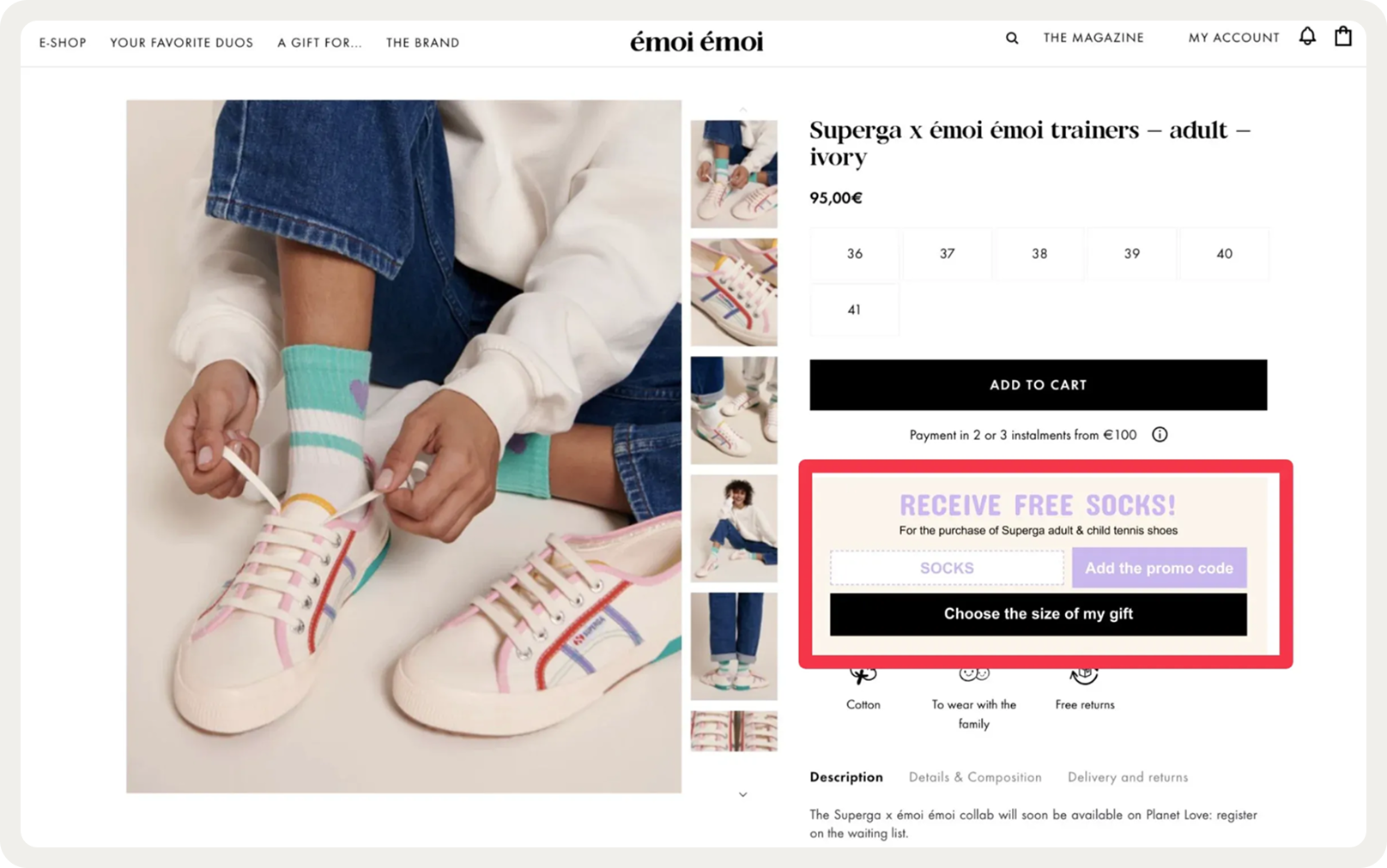 To promote their Superga collab, émoi émoi encouraged shoppers to match with their kids: buy two pairs of shoes, get a free pair of socks.