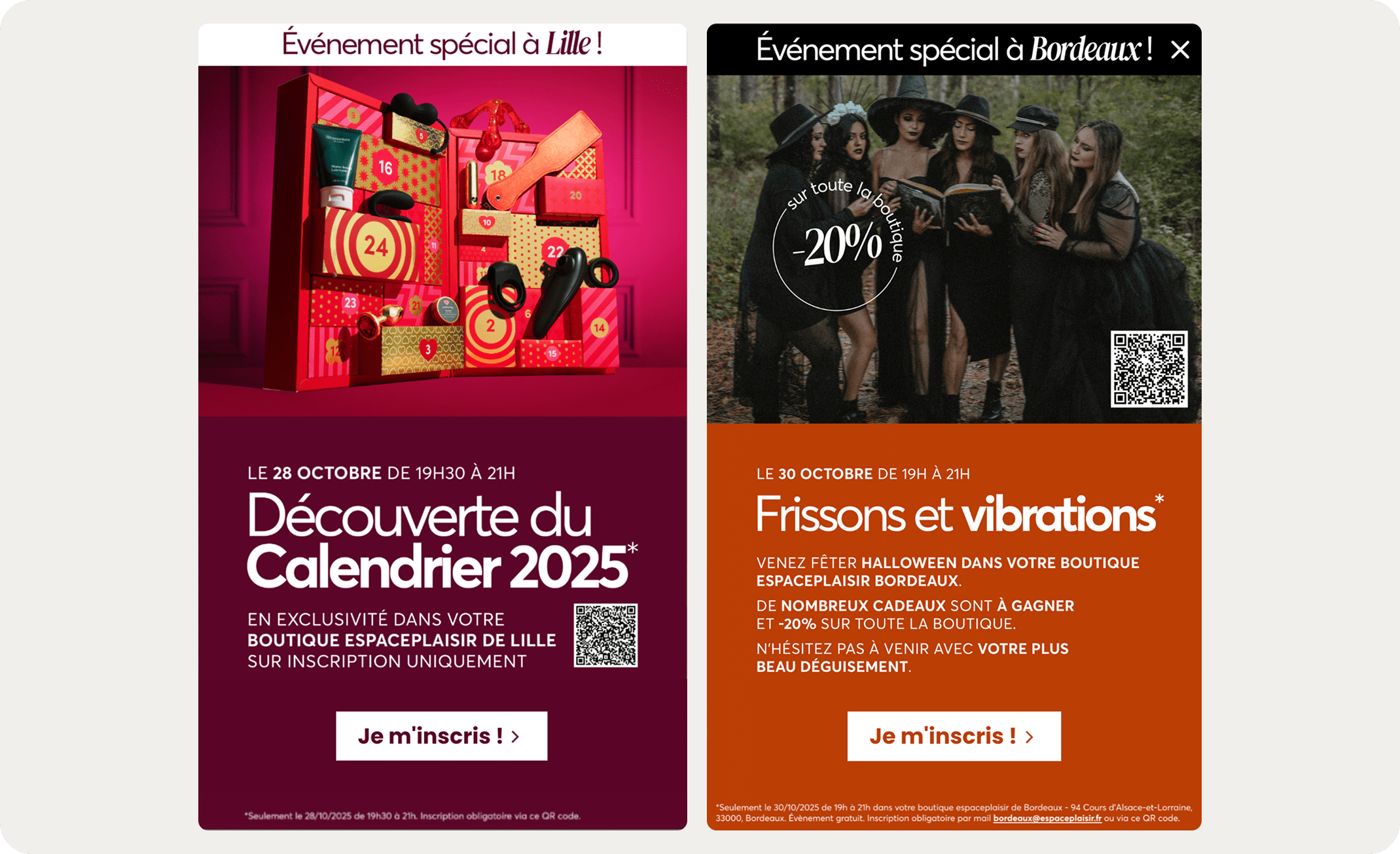 City-specific campaigns (Bordeaux, Lille) promoting exclusive in-store experiences with QR codes for easy registration—connecting digital traffic to physical retail events and building local community engagement.