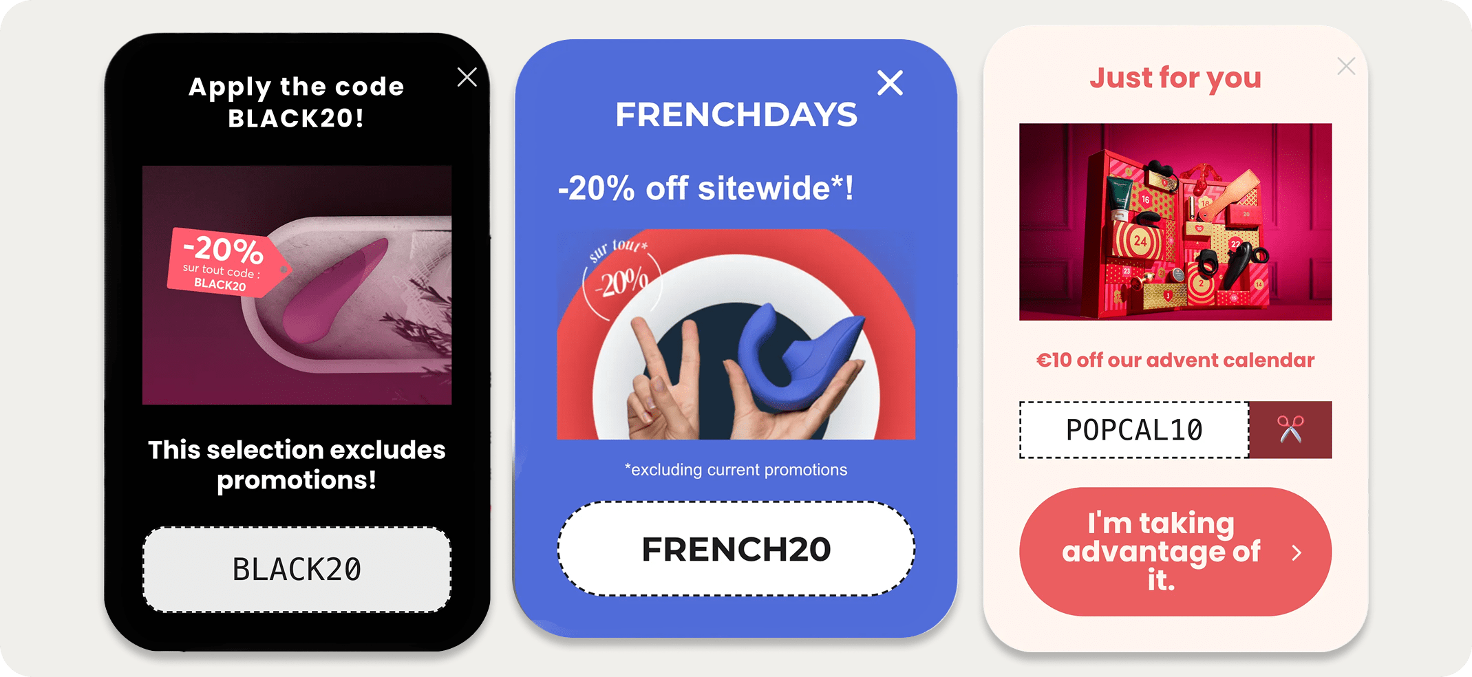 Coordinated campaigns for Black Friday, French Days, and holiday seasons (advent calendar offers) aligned with key retail moments. These campaigns use both popups for high visibility and top bars for persistent awareness across the site.