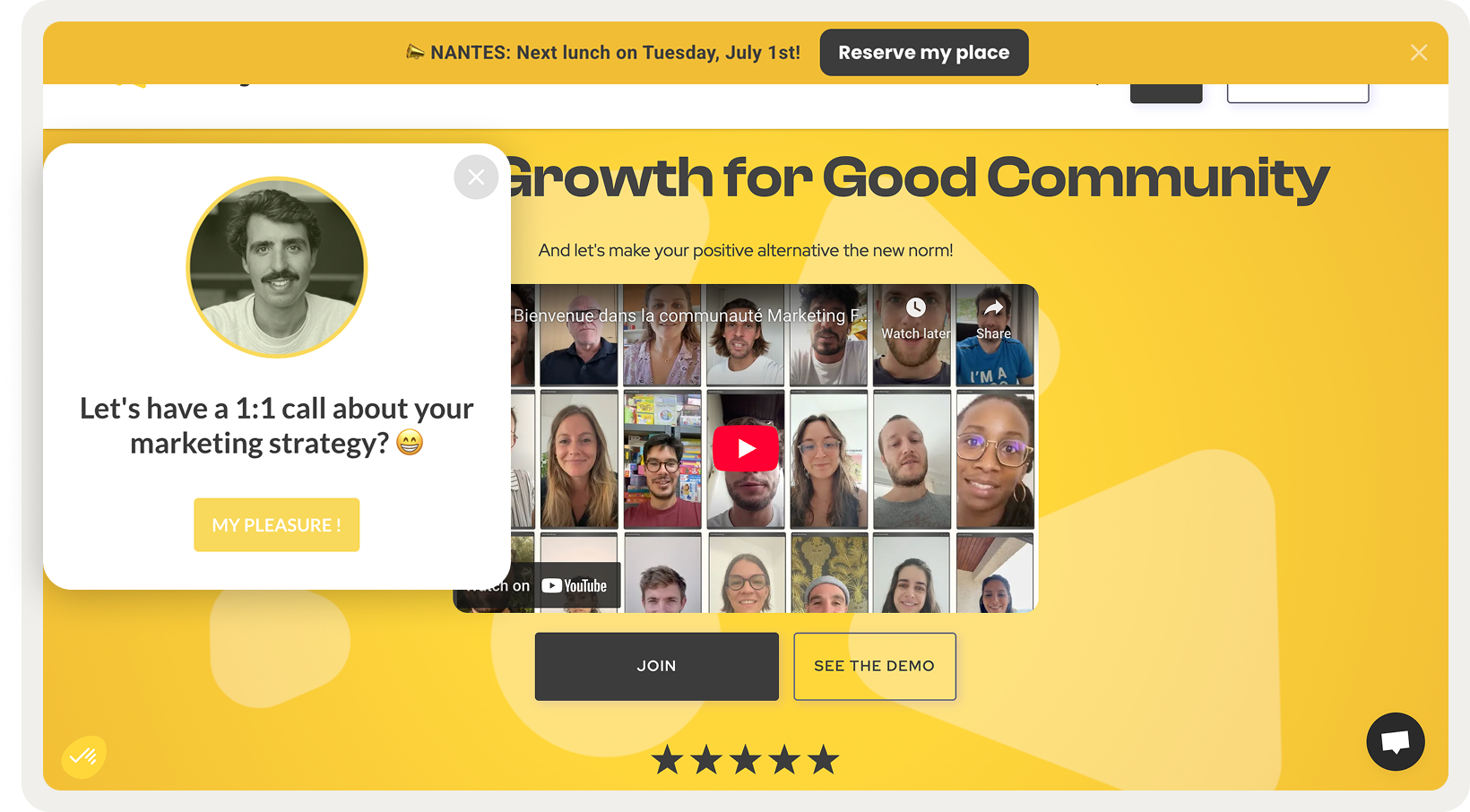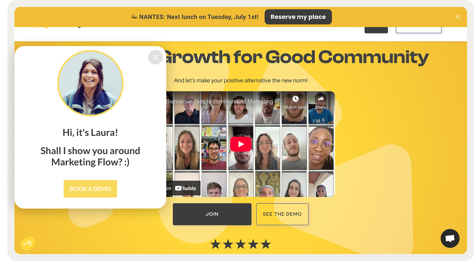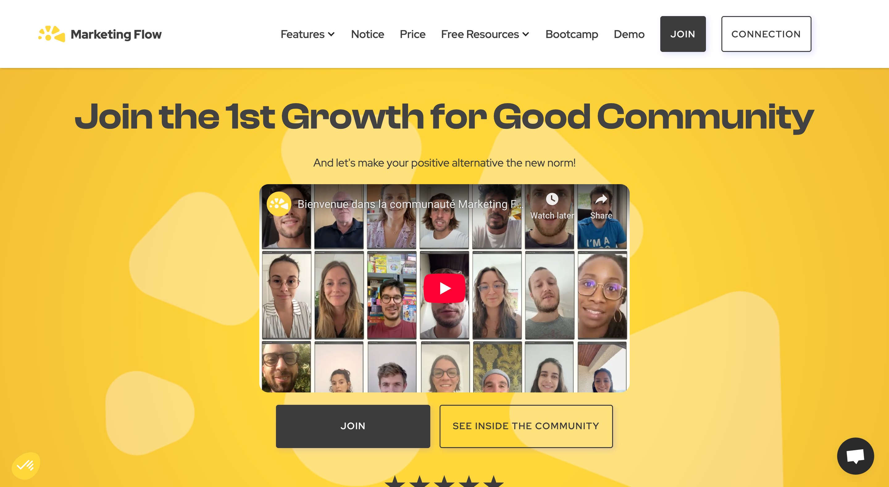 Marketing Flow showcases real members and founders from the first seconds on site: