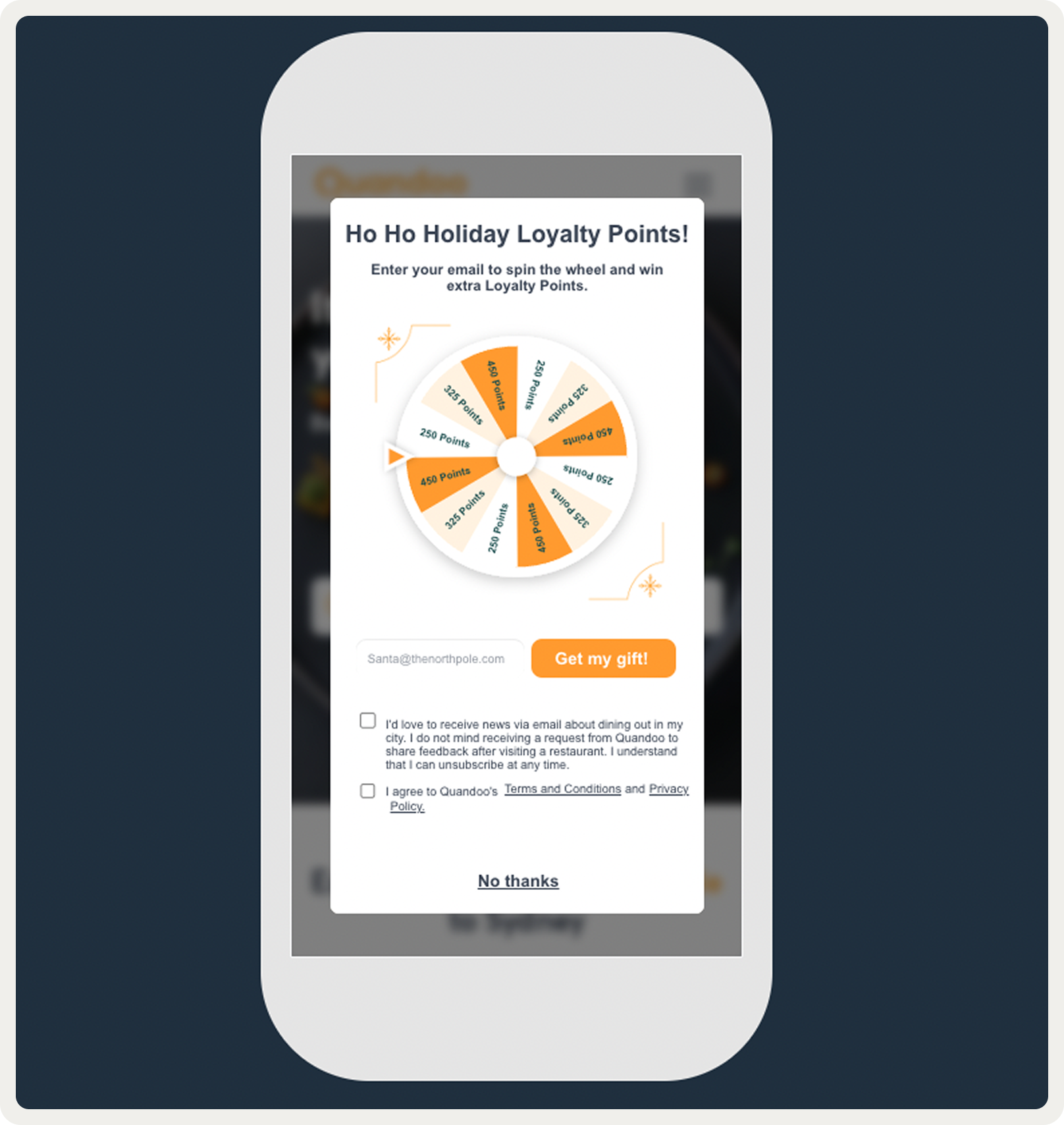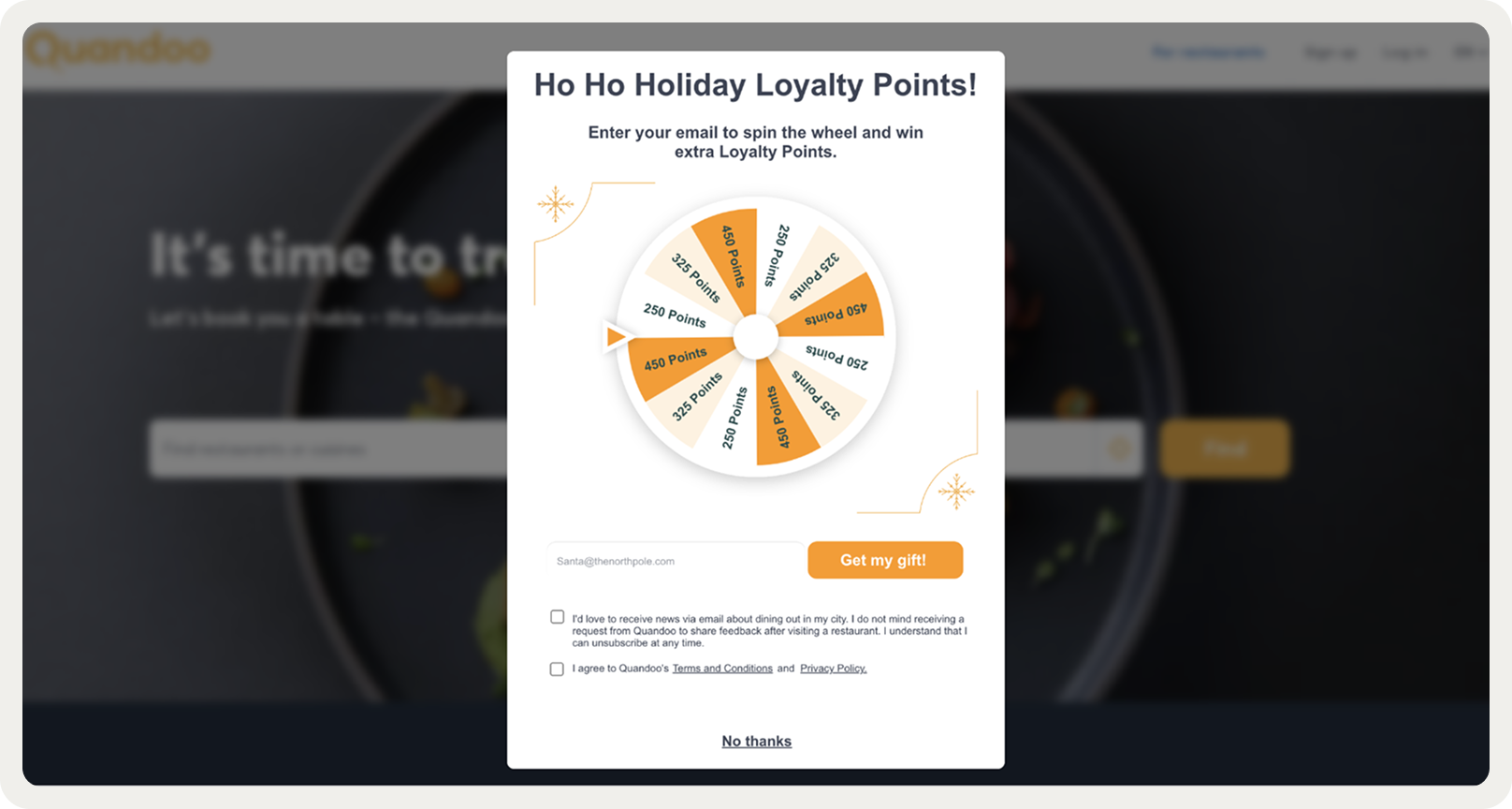 Visitors could get different amounts of points (250, 325, and 450), and every participant won, as the wheel had no “0 points” or any other losing options. Quandoo created customized versions of this campaign for the Quandoo website operating in different countries, including Australia, Austria, and Singapore.